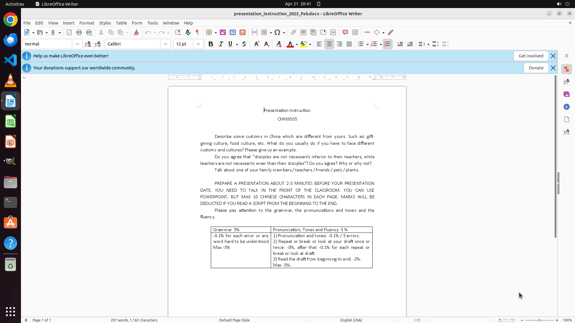 **Context**: Document is single-page. Status bar shows "Page 1 of 1". The visible uppercase text includes: heading "CHIN9505" and a paragraph section starting with "PREPARE A PRESENTATION ABOUT 2-3 MINUTES...". Document format: LibreOffice Writer, Calibri font, 12pt, normal style.
