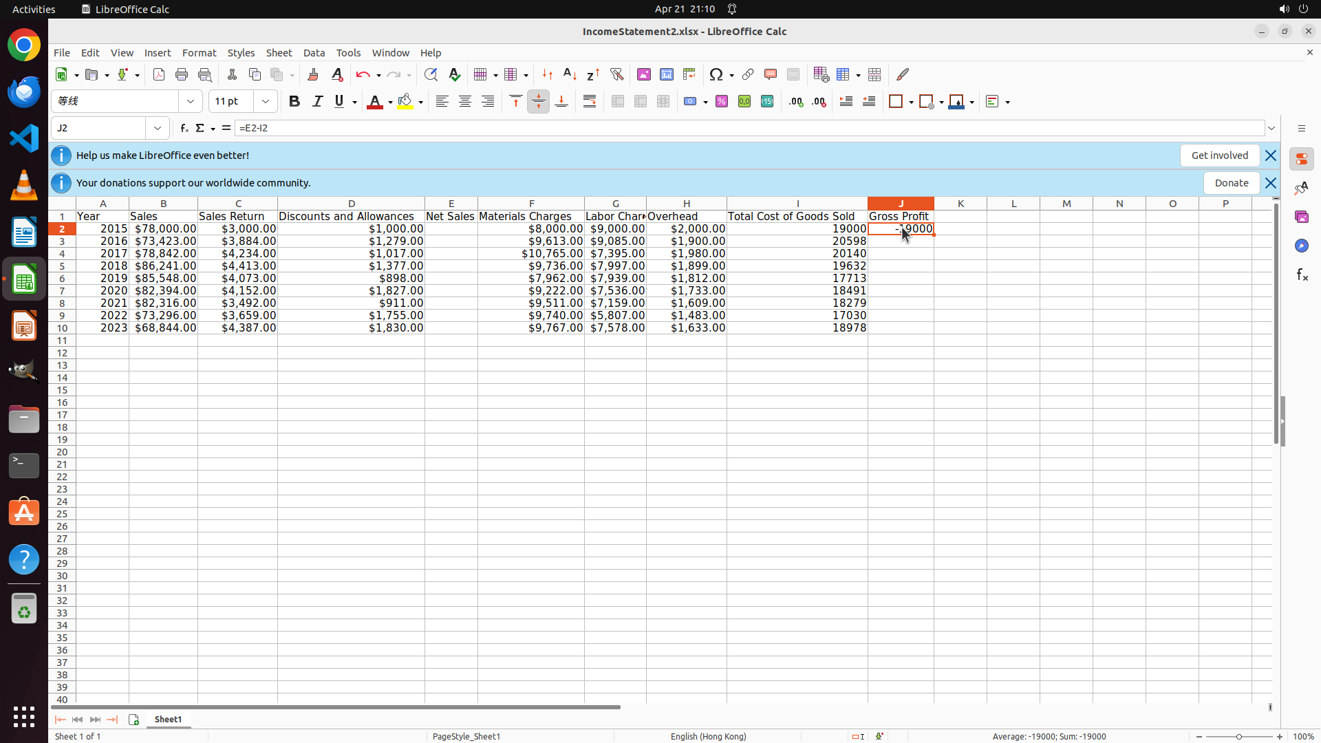 - LibreOffice Calc is open with IncomeStatement2.xlsx file