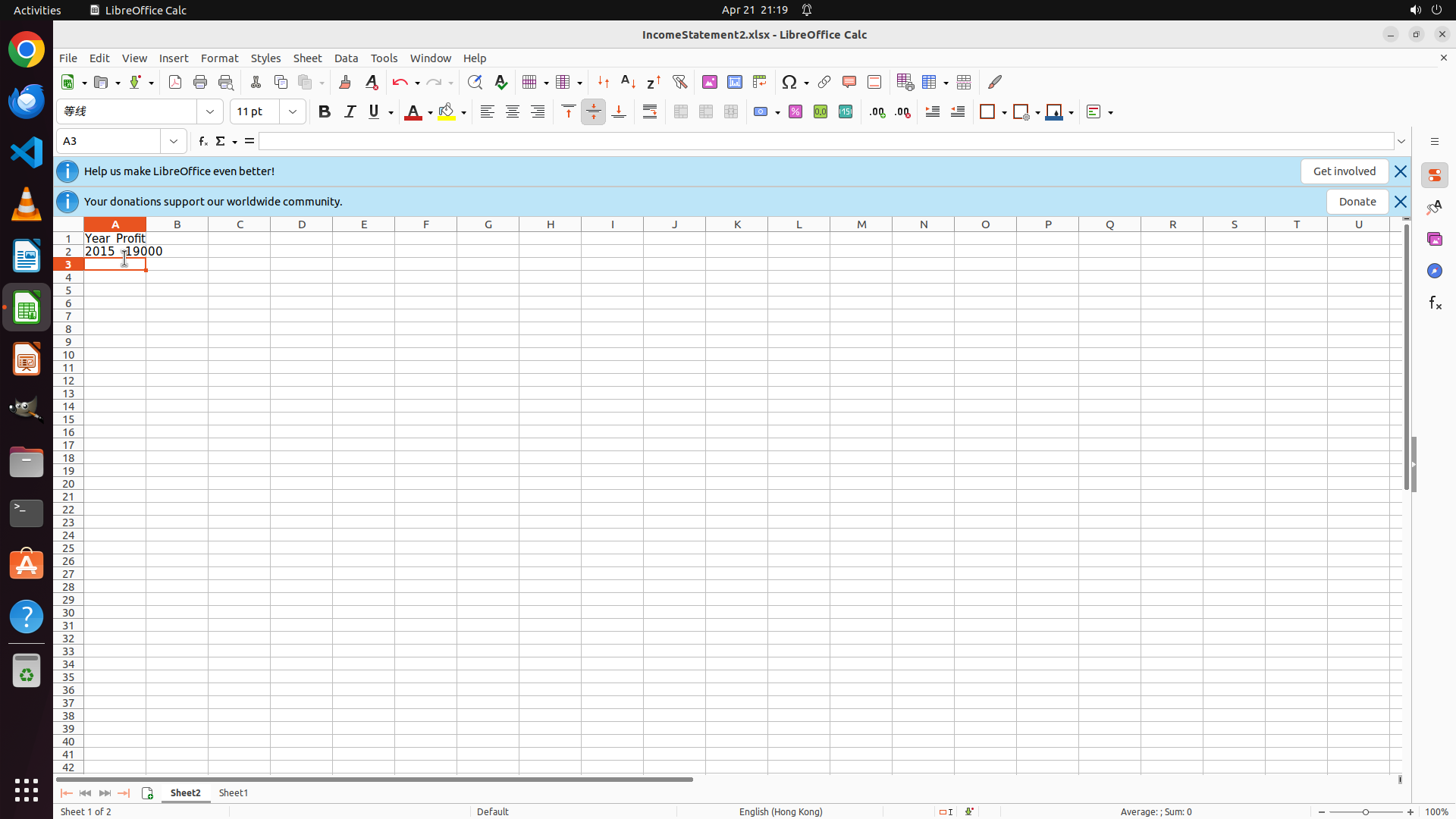 Perfect! I'm now on Sheet2 with cell A2 selected. The header "Year_Profit" is already in A1. Now I need to:
