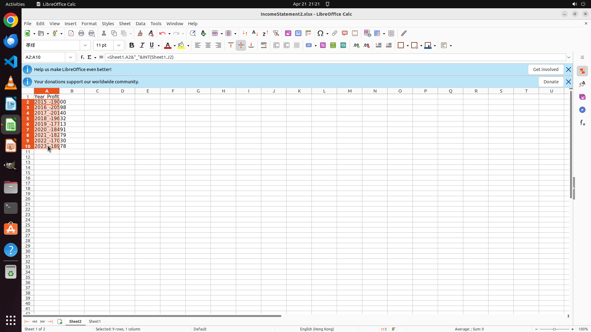 - Need to enter formula to concatenate Year from Sheet1 column A with integer Gross Profit from Sheet1 column J