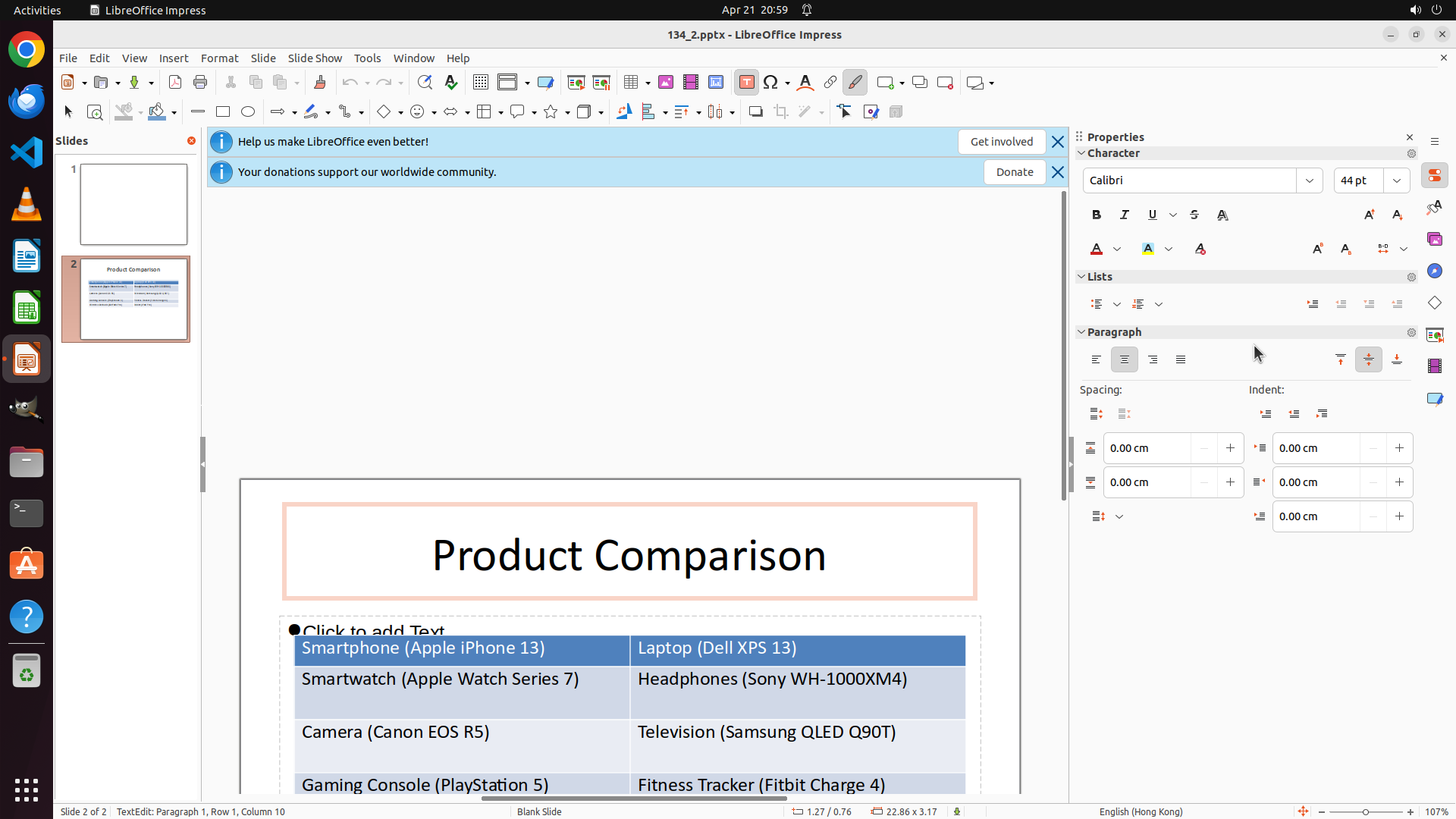 2. **第2张幻灯片缩略图**:在左侧 Slides 面板中,可以看到第2张幻灯片的缩略图,标题显示为 "Product Comparison",内容似乎包含一个表格。
