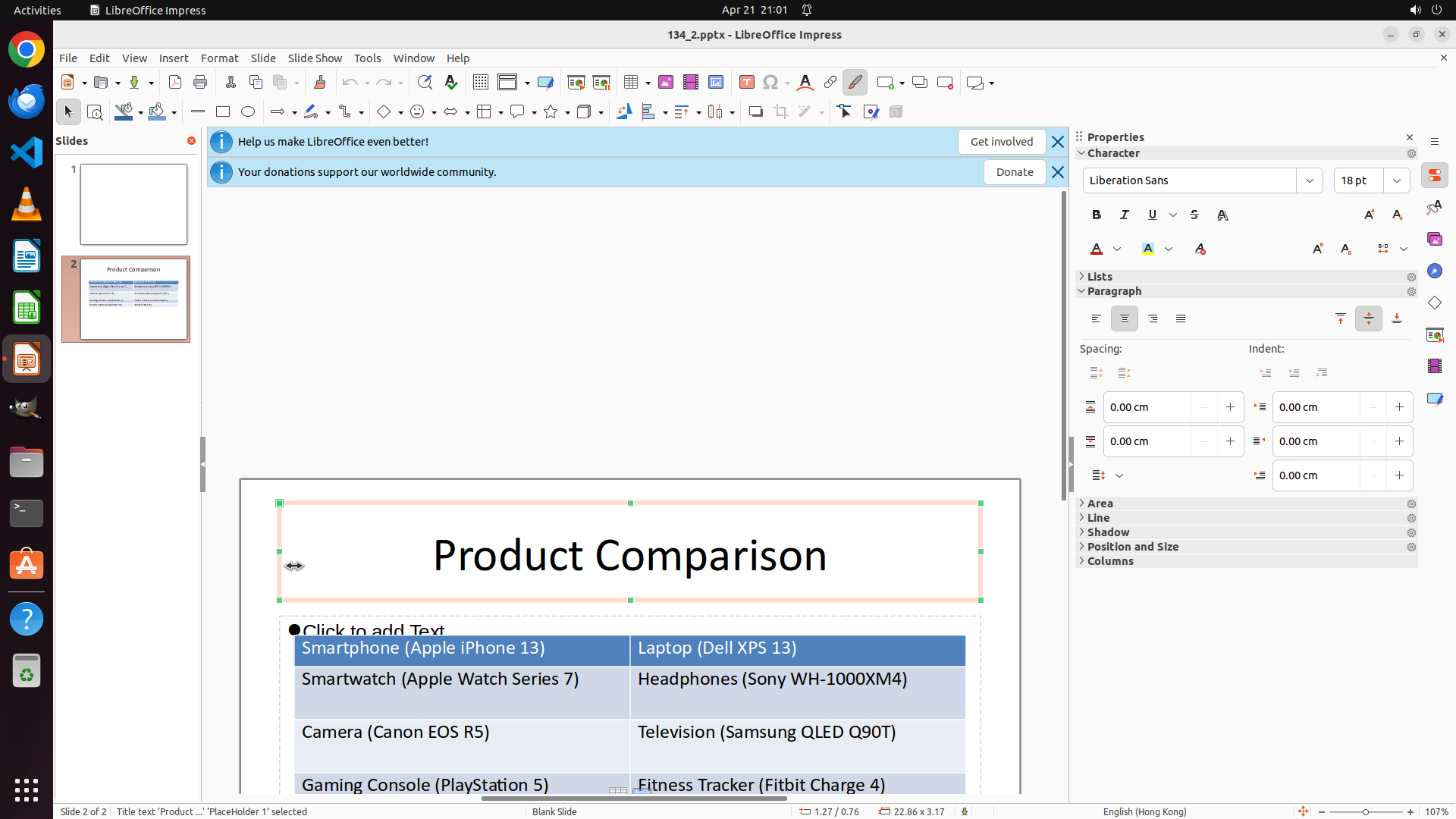 2. **第2张幻灯片缩略图**:在左侧 Slides 面板中,可以看到第2张幻灯片的缩略图,标题显示为 "Product Comparison",内容似乎包含一个表格。