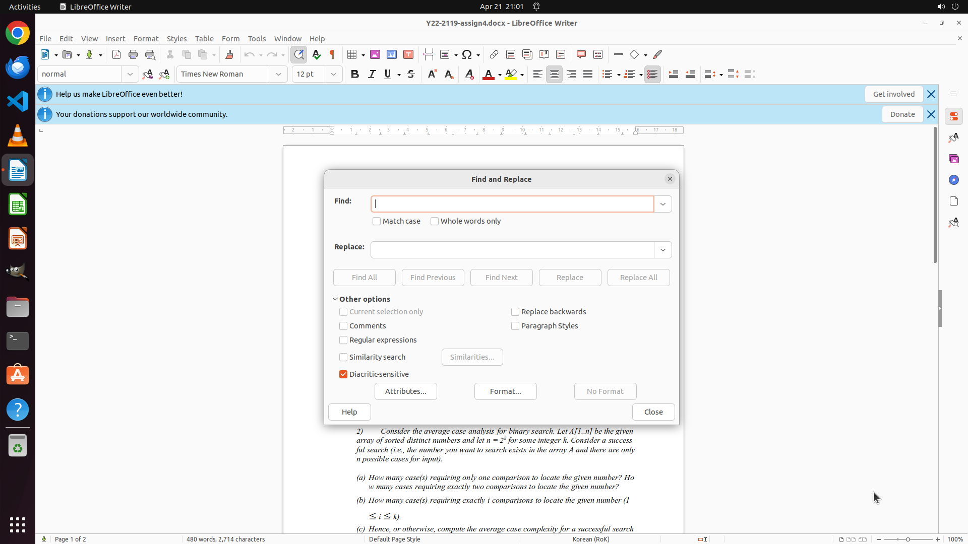 - LibreOffice Writer is open with a document about "COMP 2119C Introduction to Data Structures and Algorithms"