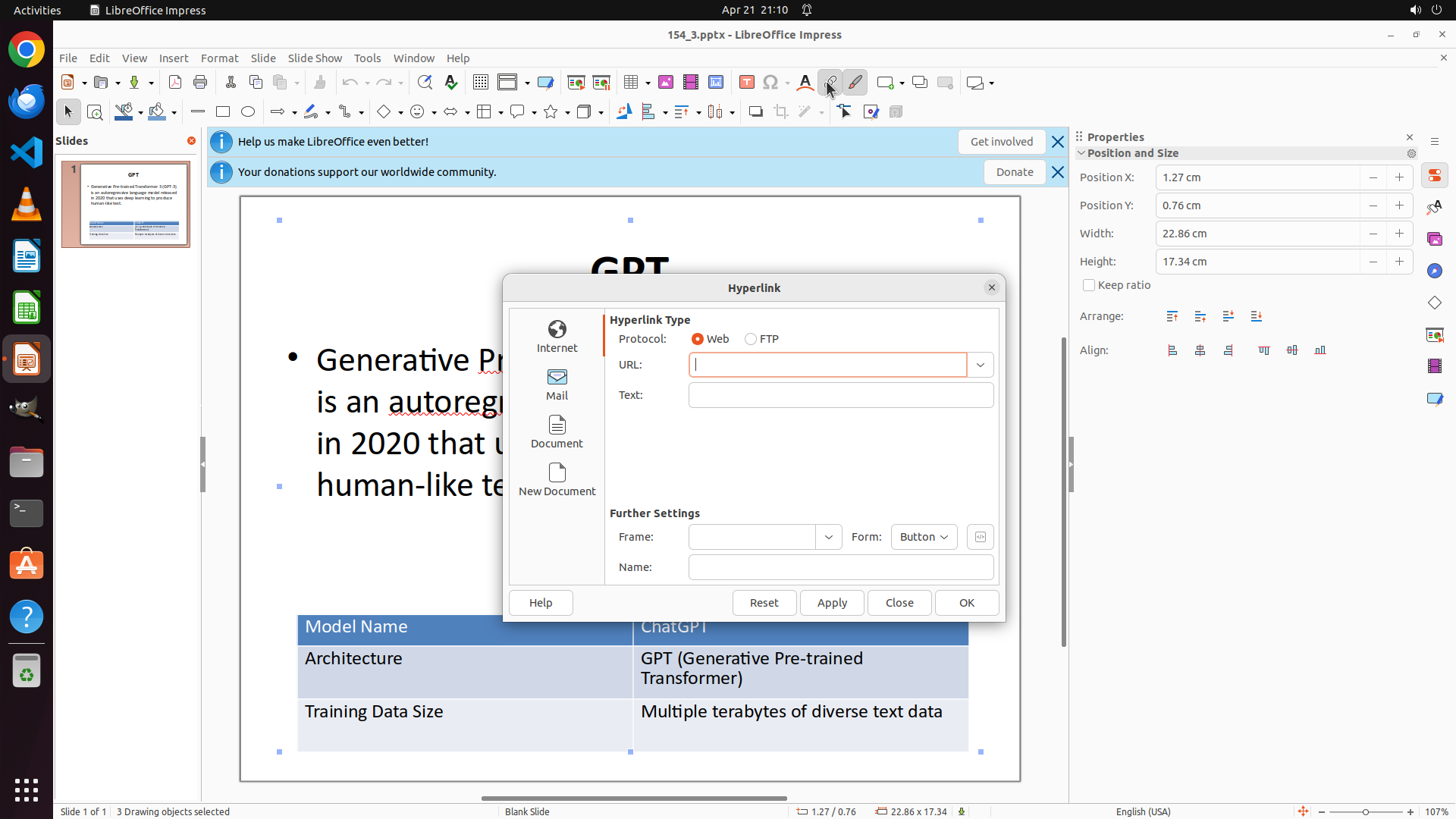 ## 6. 上一次操作的前50步操作简述 ### 步骤 1: - 描述: #### 重要信息 LibreOffice Impress 已打开,显示一张包含以下内容的幻灯片: - 标题:"GPT" - 正文文本:关于 GPT-3 的段落(带项目符号) - 表格:包含 Model Name、ChatGPT、Architecture、GPT (Generative Pre-trained Transformer)、Training Data Size、Multiple terabytes of diverse text data 等内容 所有文本目前都是黑色,没有下划线。 #### 情况分析与思考过程 任务要求: 1. 给整个幻灯片的所有文本(标题、正文、表格)设置深红色2(dark red 2)字体颜色 2. 仅给正文文本添加深红色2的下划线(不包括标题和表格) 策略: - 首先选择所有内容并更改字体颜色为 dark red 2 - 然后单独选择正文文本并添加下划线 第一步:使用 Ctrl+A 选择幻灯片上的所有内容,然后应用字体颜色。</think> - 操作: 1. 按下键盘按键: ctrl, a </SITUATION>