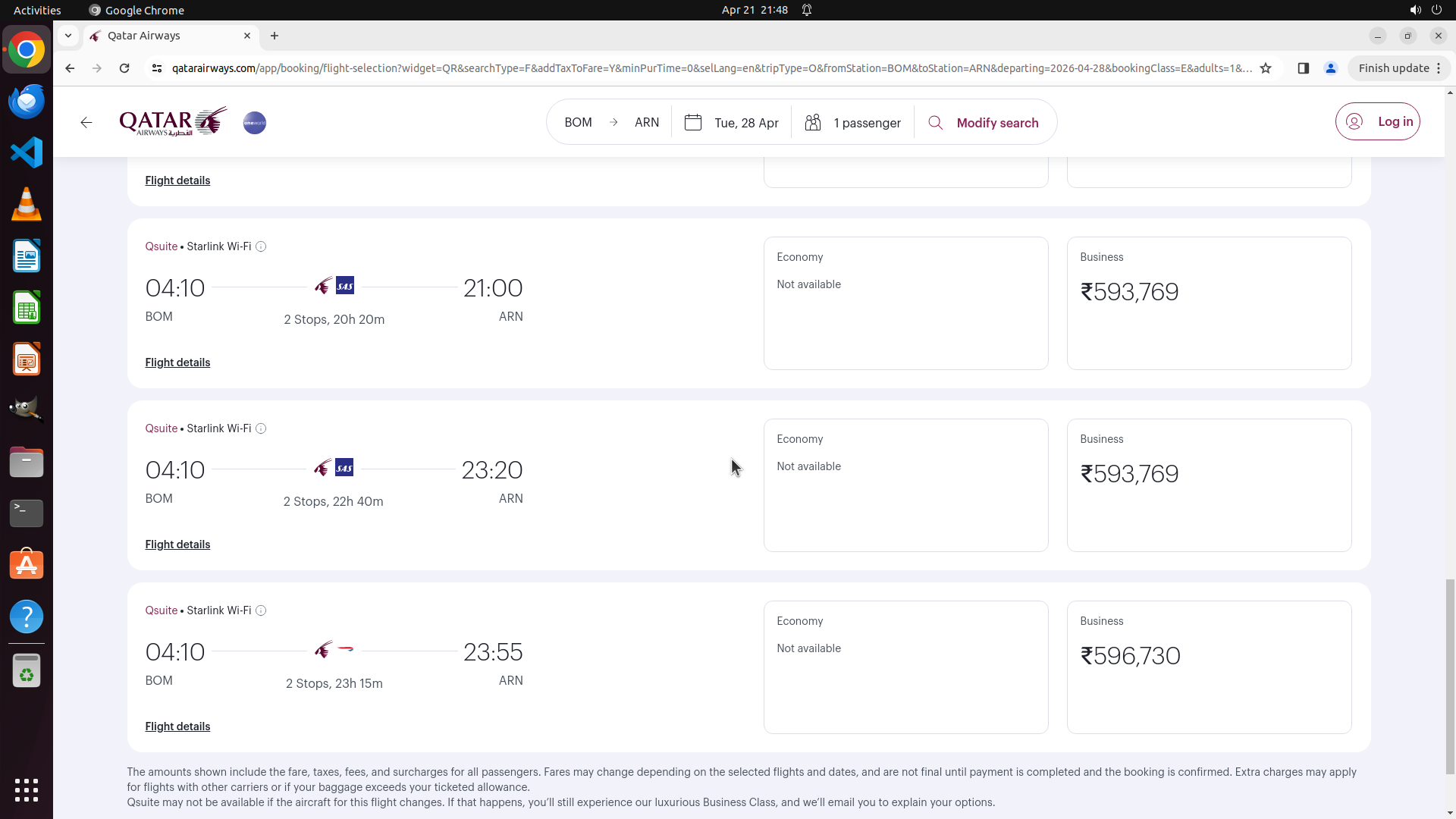 - 选项3: 04:10 BOM → 19:25+1 ARN, 2次中转, 42小时45分钟, 商务舱 ₹568,540, 经济舱不可用