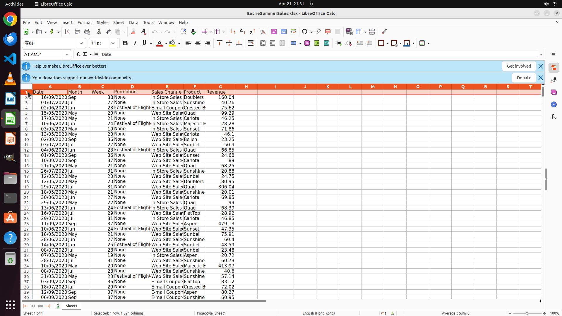 - The spreadsheet shows data with columns: Date, Month, Week, Promotion, Sales Channel, Product, Revenue