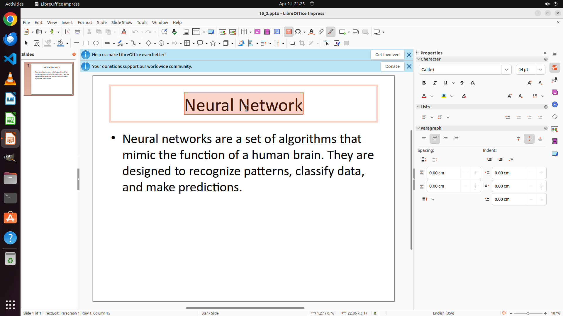 ## 6. 上一次操作的前50步操作简述 ### 步骤 1: - 描述: ``` #### 重要信息 LibreOffice Impress is open with a presentation containing a slide titled "Neural Network" with bullet point content. The slide currently has: - White/blank background - Black text - Font size appears larger than 12 The Properties panel is visible on the right showing "Background: None". I need to: 1. Select all text content 2. Change font size to 12 3. Change font color to orange 4. Change slide background to red #### 情况分析与思考过程 To accomplish this task, I need to: 1. First click on the text area to enter edit mode 2. Select all text (Ctrl+A) 3. Change font size to 12 using the toolbar or Format menu 4. Change font color to orange using the font color button 5. Click outside text boxes to select the slide itself 6. Change background to red using the Properties panel Let me start by clicking on the title text to enter edit mode, then select all content. I'll begin with clicking on the title "Neural Network" to activate text editing mode. ``` - 操作: 1. 左键单击坐标 (0.43, 0.329) </SITUATION>