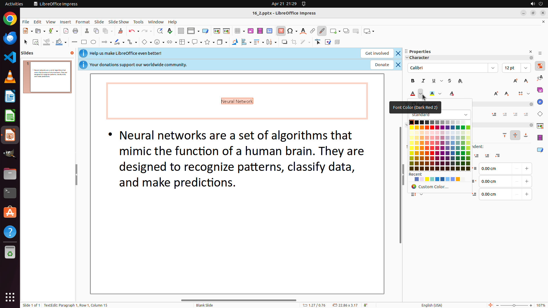 ## 6. 上一次操作的前50步操作简述 ### 步骤 1: - 描述: ``` #### 重要信息 LibreOffice Impress is open with a presentation containing a slide titled "Neural Network" with bullet point content. The slide currently has: - White/blank background - Black text - Font size appears larger than 12 The Properties panel is visible on the right showing "Background: None". I need to: 1. Select all text content 2. Change font size to 12 3. Change font color to orange 4. Change slide background to red #### 情况分析与思考过程 To accomplish this task, I need to: 1. First click on the text area to enter edit mode 2. Select all text (Ctrl+A) 3. Change font size to 12 using the toolbar or Format menu 4. Change font color to orange using the font color button 5. Click outside text boxes to select the slide itself 6. Change background to red using the Properties panel Let me start by clicking on the title text to enter edit mode, then select all content. I'll begin with clicking on the title "Neural Network" to activate text editing mode. ``` - 操作: 1. 左键单击坐标 (0.43, 0.329) ### 步骤 2: - 描述: ``` #### 重要信息 LibreOffice Impress is open with a slide containing "Neural Network" title and bullet point text. I've clicked on the title and now I'm in text editing mode (the title text box is active with an orange border). The status bar shows "TextEdit: Paragraph 1, Row 1, Column 8". The current font size is 44 pt as shown in the Properties panel on the right. #### 情况分析与思考过程 I'm now in text editing mode for the title. To accomplish the task, I need to: 1. First select all text in this text box (Ctrl+A) 2. Change font size to 12 3. Change font color to orange 4. Then do the same for the bullet point text 5. Finally change the slide background to red Let me start by selecting all text in the current title text box using Ctrl+A. This will allow me to apply formatting changes to the entire title at once. ``` - 操作: 1. 按下键盘按键: ctrl, a ### 步骤 3: - 描述: ``` #### 重要信息 The title "Neural Network" is now selected (highlighted with darker background). The status bar shows "TextEdit: Paragraph 1, Row 1, Column 15" indicating all text in the title box is selected. The Properties panel on the right shows the current font size is "44 pt" in the Character section. #### 情况分析与思考过程 Good progress! The title text is now selected. Now I need to: 1. Change the font size from 44 pt to 12 2. Change the font color to orange 3. Then select and format the bullet point text 4. Finally change the slide background to red I can see the font size field showing "44 pt" in the Properties panel on the right. I'll click on it and change it to 12. This is more direct than using the Format menu. ``` - 操作: 1. 左键三击坐标 (0.93, 0.22) ### 步骤 4: - 描述: ``` #### 重要信息 The font size field in the Properties panel is now selected (showing "44 pt" highlighted). The title "Neural Network" remains selected in the slide. The font size field is ready for me to type the new value. #### 情况分析与思考过程 Perfect! The font size field is selected. Now I need to: 1. Type "12" to replace the current "44 pt" value 2. Press Enter to apply the change 3. Then change the font color to orange 4. Then select and format the bullet point text 5. Finally change the slide background to red I'll type "12" now to change the font size. ``` - 操作: 1. 输入文本: 12 ### 步骤 5: - 描述: ``` #### 重要信息 The font size field in the Properties panel now shows "12" but the change hasn't been applied yet - the title text still appears large. I need to press Enter to confirm and apply the font size change. The title "Neural Network" remains selected. #### 情况分析与思考过程 I've successfully typed "12" in the font size field. Now I need to press Enter to apply this change. After that, I'll need to: 1. Change the font color to orange 2. Select the bullet point text and apply the same formatting (size 12, orange) 3. Change the slide background to red Pressing Enter now will apply the font size change to the selected title text. ``` I'll press Enter to apply the font size change. - 操作: 1. 按下键盘按键: enter </SITUATION>