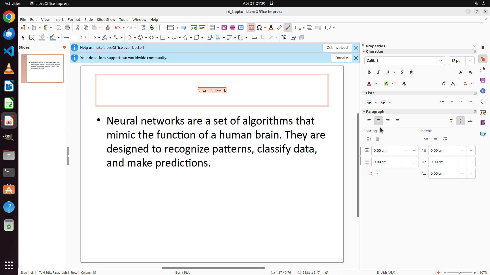 ## 6. 上一次操作的前50步操作简述 ### 步骤 1: - 描述: ``` #### 重要信息 LibreOffice Impress is open with a presentation containing a slide titled "Neural Network" with bullet point content. The slide currently has: - White/blank background - Black text - Font size appears larger than 12 The Properties panel is visible on the right showing "Background: None". I need to: 1. Select all text content 2. Change font size to 12 3. Change font color to orange 4. Change slide background to red #### 情况分析与思考过程 To accomplish this task, I need to: 1. First click on the text area to enter edit mode 2. Select all text (Ctrl+A) 3. Change font size to 12 using the toolbar or Format menu 4. Change font color to orange using the font color button 5. Click outside text boxes to select the slide itself 6. Change background to red using the Properties panel Let me start by clicking on the title text to enter edit mode, then select all content. I'll begin with clicking on the title "Neural Network" to activate text editing mode. ``` - 操作: 1. 左键单击坐标 (0.43, 0.329) ### 步骤 2: - 描述: ``` #### 重要信息 LibreOffice Impress is open with a slide containing "Neural Network" title and bullet point text. I've clicked on the title and now I'm in text editing mode (the title text box is active with an orange border). The status bar shows "TextEdit: Paragraph 1, Row 1, Column 8". The current font size is 44 pt as shown in the Properties panel on the right. #### 情况分析与思考过程 I'm now in text editing mode for the title. To accomplish the task, I need to: 1. First select all text in this text box (Ctrl+A) 2. Change font size to 12 3. Change font color to orange 4. Then do the same for the bullet point text 5. Finally change the slide background to red Let me start by selecting all text in the current title text box using Ctrl+A. This will allow me to apply formatting changes to the entire title at once. ``` - 操作: 1. 按下键盘按键: ctrl, a ### 步骤 3: - 描述: ``` #### 重要信息 The title "Neural Network" is now selected (highlighted with darker background). The status bar shows "TextEdit: Paragraph 1, Row 1, Column 15" indicating all text in the title box is selected. The Properties panel on the right shows the current font size is "44 pt" in the Character section. #### 情况分析与思考过程 Good progress! The title text is now selected. Now I need to: 1. Change the font size from 44 pt to 12 2. Change the font color to orange 3. Then select and format the bullet point text 4. Finally change the slide background to red I can see the font size field showing "44 pt" in the Properties panel on the right. I'll click on it and change it to 12. This is more direct than using the Format menu. ``` - 操作: 1. 左键三击坐标 (0.93, 0.22) ### 步骤 4: - 描述: ``` #### 重要信息 The font size field in the Properties panel is now selected (showing "44 pt" highlighted). The title "Neural Network" remains selected in the slide. The font size field is ready for me to type the new value. #### 情况分析与思考过程 Perfect! The font size field is selected. Now I need to: 1. Type "12" to replace the current "44 pt" value 2. Press Enter to apply the change 3. Then change the font color to orange 4. Then select and format the bullet point text 5. Finally change the slide background to red I'll type "12" now to change the font size. ``` - 操作: 1. 输入文本: 12 ### 步骤 5: - 描述: ``` #### 重要信息 The font size field in the Properties panel now shows "12" but the change hasn't been applied yet - the title text still appears large. I need to press Enter to confirm and apply the font size change. The title "Neural Network" remains selected. #### 情况分析与思考过程 I've successfully typed "12" in the font size field. Now I need to press Enter to apply this change. After that, I'll need to: 1. Change the font color to orange 2. Select the bullet point text and apply the same formatting (size 12, orange) 3. Change the slide background to red Pressing Enter now will apply the font size change to the selected title text. ``` I'll press Enter to apply the font size change. - 操作: 1. 按下键盘按键: enter ### 步骤 6: - 描述: ``` #### 重要信息 The font size change has been successfully applied! The title "Neural Network" is now displayed in a much smaller font size (12 pt instead of 44 pt). The title text box remains selected with the orange border. The Properties panel still shows "12 pt" confirming the change. Now I need to: 1. Change the font color to orange for the selected title text 2. Select and format the bullet point text with the same settings (size 12, orange) 3. Change the slide background to red I can see in the Properties panel on the right there's a font color button (the "A" with a colored underline) in the Character section. I need to click on the dropdown arrow next to it to open the color picker. #### 情况分析与思考过程 The title text is still selected, which is perfect for applying the font color change. I can see the font color button in the Properties panel's Character section. It shows an "A" with what appears to be a red/orange underline and a dropdown arrow next to it. I should click on the dropdown arrow to open the color palette where I can select orange. After changing the title color to orange, I'll need to: 1. Click on the bullet point text to select it 2. Select all text in that text box (Ctrl+A) 3. Change its font size to 12 4. Change its color to orange 5. Finally, change the slide background to red Let me click on the font color dropdown arrow in the Properties panel to open the color picker. ``` - 操作: 1. 左键单击坐标 (0.768, 0.301) </SITUATION>