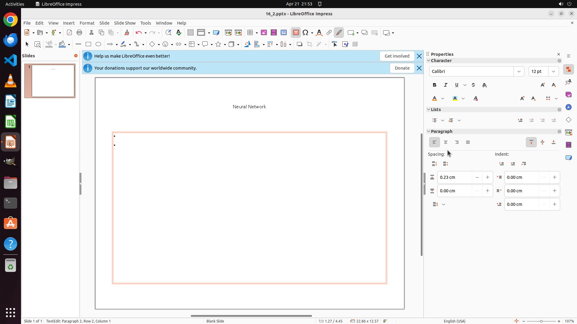 ## 6. 上一次操作的前50步操作简述 ### 步骤 1: - 描述: ``` #### 重要信息 LibreOffice Impress is open with a presentation containing a slide titled "Neural Network" with bullet point content. The slide currently has: - White/blank background - Black text - Font size appears larger than 12 The Properties panel is visible on the right showing "Background: None". I need to: 1. Select all text content 2. Change font size to 12 3. Change font color to orange 4. Change slide background to red #### 情况分析与思考过程 To accomplish this task, I need to: 1. First click on the text area to enter edit mode 2. Select all text (Ctrl+A) 3. Change font size to 12 using the toolbar or Format menu 4. Change font color to orange using the font color button 5. Click outside text boxes to select the slide itself 6. Change background to red using the Properties panel Let me start by clicking on the title text to enter edit mode, then select all content. I'll begin with clicking on the title "Neural Network" to activate text editing mode. ``` - 操作: 1. 左键单击坐标 (0.43, 0.329) ### 步骤 2: - 描述: ``` #### 重要信息 LibreOffice Impress is open with a slide containing "Neural Network" title and bullet point text. I've clicked on the title and now I'm in text editing mode (the title text box is active with an orange border). The status bar shows "TextEdit: Paragraph 1, Row 1, Column 8". The current font size is 44 pt as shown in the Properties panel on the right. #### 情况分析与思考过程 I'm now in text editing mode for the title. To accomplish the task, I need to: 1. First select all text in this text box (Ctrl+A) 2. Change font size to 12 3. Change font color to orange 4. Then do the same for the bullet point text 5. Finally change the slide background to red Let me start by selecting all text in the current title text box using Ctrl+A. This will allow me to apply formatting changes to the entire title at once. ``` - 操作: 1. 按下键盘按键: ctrl, a ### 步骤 3: - 描述: ``` #### 重要信息 The title "Neural Network" is now selected (highlighted with darker background). The status bar shows "TextEdit: Paragraph 1, Row 1, Column 15" indicating all text in the title box is selected. The Properties panel on the right shows the current font size is "44 pt" in the Character section. #### 情况分析与思考过程 Good progress! The title text is now selected. Now I need to: 1. Change the font size from 44 pt to 12 2. Change the font color to orange 3. Then select and format the bullet point text 4. Finally change the slide background to red I can see the font size field showing "44 pt" in the Properties panel on the right. I'll click on it and change it to 12. This is more direct than using the Format menu. ``` - 操作: 1. 左键三击坐标 (0.93, 0.22) ### 步骤 4: - 描述: ``` #### 重要信息 The font size field in the Properties panel is now selected (showing "44 pt" highlighted). The title "Neural Network" remains selected in the slide. The font size field is ready for me to type the new value. #### 情况分析与思考过程 Perfect! The font size field is selected. Now I need to: 1. Type "12" to replace the current "44 pt" value 2. Press Enter to apply the change 3. Then change the font color to orange 4. Then select and format the bullet point text 5. Finally change the slide background to red I'll type "12" now to change the font size. ``` - 操作: 1. 输入文本: 12 ### 步骤 5: - 描述: ``` #### 重要信息 The font size field in the Properties panel now shows "12" but the change hasn't been applied yet - the title text still appears large. I need to press Enter to confirm and apply the font size change. The title "Neural Network" remains selected. #### 情况分析与思考过程 I've successfully typed "12" in the font size field. Now I need to press Enter to apply this change. After that, I'll need to: 1. Change the font color to orange 2. Select the bullet point text and apply the same formatting (size 12, orange) 3. Change the slide background to red Pressing Enter now will apply the font size change to the selected title text. ``` I'll press Enter to apply the font size change. - 操作: 1. 按下键盘按键: enter ### 步骤 6: - 描述: ``` #### 重要信息 The font size change has been successfully applied! The title "Neural Network" is now displayed in a much smaller font size (12 pt instead of 44 pt). The title text box remains selected with the orange border. The Properties panel still shows "12 pt" confirming the change. Now I need to: 1. Change the font color to orange for the selected title text 2. Select and format the bullet point text with the same settings (size 12, orange) 3. Change the slide background to red I can see in the Properties panel on the right there's a font color button (the "A" with a colored underline) in the Character section. I need to click on the dropdown arrow next to it to open the color picker. #### 情况分析与思考过程 The title text is still selected, which is perfect for applying the font color change. I can see the font color button in the Properties panel's Character section. It shows an "A" with what appears to be a red/orange underline and a dropdown arrow next to it. I should click on the dropdown arrow to open the color palette where I can select orange. After changing the title color to orange, I'll need to: 1. Click on the bullet point text to select it 2. Select all text in that text box (Ctrl+A) 3. Change its font size to 12 4. Change its color to orange 5. Finally, change the slide background to red Let me click on the font color dropdown arrow in the Properties panel to open the color picker. ``` - 操作: 1. 左键单击坐标 (0.768, 0.301) ### 步骤 7: - 描述: ``` #### 重要信息 The font color picker dropdown is now open, showing a color palette with many colors. The title "Neural Network" is still selected. I can see various colors in the palette includin