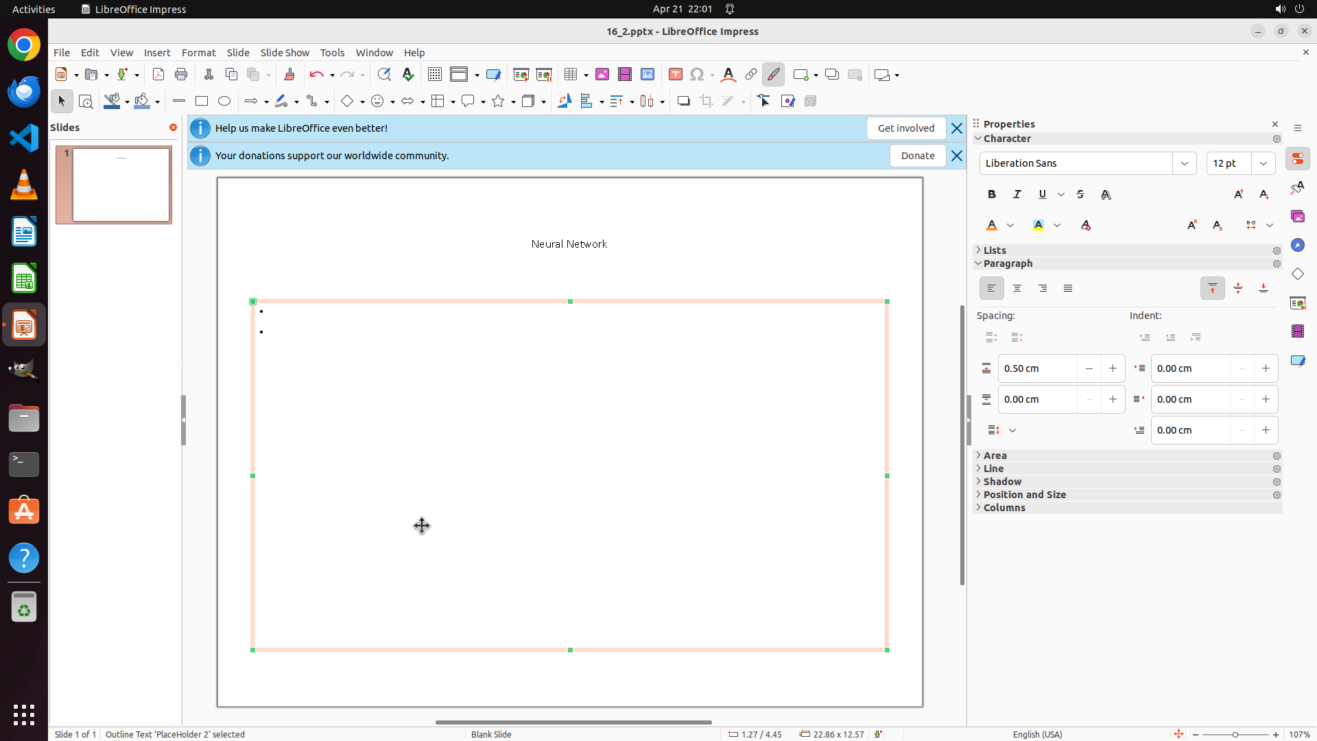 ## 6. 上一次操作的前50步操作简述 ### 步骤 1: - 描述: ``` #### 重要信息 LibreOffice Impress is open with a presentation containing a slide titled "Neural Network" with bullet point content. The slide currently has: - White/blank background - Black text - Font size appears larger than 12 The Properties panel is visible on the right showing "Background: None". I need to: 1. Select all text content 2. Change font size to 12 3. Change font color to orange 4. Change slide background to red #### 情况分析与思考过程 To accomplish this task, I need to: 1. First click on the text area to enter edit mode 2. Select all text (Ctrl+A) 3. Change font size to 12 using the toolbar or Format menu 4. Change font color to orange using the font color button 5. Click outside text boxes to select the slide itself 6. Change background to red using the Properties panel Let me start by clicking on the title text to enter edit mode, then select all content. I'll begin with clicking on the title "Neural Network" to activate text editing mode. ``` - 操作: 1. 左键单击坐标 (0.43, 0.329) ### 步骤 2: - 描述: ``` #### 重要信息 LibreOffice Impress is open with a slide containing "Neural Network" title and bullet point text. I've clicked on the title and now I'm in text editing mode (the title text box is active with an orange border). The status bar shows "TextEdit: Paragraph 1, Row 1, Column 8". The current font size is 44 pt as shown in the Properties panel on the right. #### 情况分析与思考过程 I'm now in text editing mode for the title. To accomplish the task, I need to: 1. First select all text in this text box (Ctrl+A) 2. Change font size to 12 3. Change font color to orange 4. Then do the same for the bullet point text 5. Finally change the slide background to red Let me start by selecting all text in the current title text box using Ctrl+A. This will allow me to apply formatting changes to the entire title at once. ``` - 操作: 1. 按下键盘按键: ctrl, a ### 步骤 3: - 描述: ``` #### 重要信息 The title "Neural Network" is now selected (highlighted with darker background). The status bar shows "TextEdit: Paragraph 1, Row 1, Column 15" indicating all text in the title box is selected. The Properties panel on the right shows the current font size is "44 pt" in the Character section. #### 情况分析与思考过程 Good progress! The title text is now selected. Now I need to: 1. Change the font size from 44 pt to 12 2. Change the font color to orange 3. Then select and format the bullet point text 4. Finally change the slide background to red I can see the font size field showing "44 pt" in the Properties panel on the right. I'll click on it and change it to 12. This is more direct than using the Format menu. ``` - 操作: 1. 左键三击坐标 (0.93, 0.22) ### 步骤 4: - 描述: ``` #### 重要信息 The font size field in the Properties panel is now selected (showing "44 pt" highlighted). The title "Neural Network" remains selected in the slide. The font size field is ready for me to type the new value. #### 情况分析与思考过程 Perfect! The font size field is selected. Now I need to: 1. Type "12" to replace the current "44 pt" value 2. Press Enter to apply the change 3. Then change the font color to orange 4. Then select and format the bullet point text 5. Finally change the slide background to red I'll type "12" now to change the font size. ``` - 操作: 1. 输入文本: 12 ### 步骤 5: - 描述: ``` #### 重要信息 The font size field in the Properties panel now shows "12" but the change hasn't been applied yet - the title text still appears large. I need to press Enter to confirm and apply the font size change. The title "Neural Network" remains selected. #### 情况分析与思考过程 I've successfully typed "12" in the font size field. Now I need to press Enter to apply this change. After that, I'll need to: 1. Change the font color to orange 2. Select the bullet point text and apply the same formatting (size 12, orange) 3. Change the slide background to red Pressing Enter now will apply the font size change to the selected title text. ``` I'll press Enter to apply the font size change. - 操作: 1. 按下键盘按键: enter ### 步骤 6: - 描述: ``` #### 重要信息 The font size change has been successfully applied! The title "Neural Network" is now displayed in a much smaller font size (12 pt instead of 44 pt). The title text box remains selected with the orange border. The Properties panel still shows "12 pt" confirming the change. Now I need to: 1. Change the font color to orange for the selected title text 2. Select and format the bullet point text with the same settings (size 12, orange) 3. Change the slide background to red I can see in the Properties panel on the right there's a font color button (the "A" with a colored underline) in the Character section. I need to click on the dropdown arrow next to it to open the color picker. #### 情况分析与思考过程 The title text is still selected, which is perfect for applying the font color change. I can see the font color button in the Properties panel's Character section. It shows an "A" with what appears to be a red/orange underline and a dropdown arrow next to it. I should click on the dropdown arrow to open the color palette where I can select orange. After changing the title color to orange, I'll need to: 1. Click on the bullet point text to select it 2. Select all text in that text box (Ctrl+A) 3. Change its font size to 12 4. Change its color to orange 5. Finally, change the slide background to red Let me click on the font color dropdown arrow in the Properties panel to open the color picker. ``` - 操作: 1. 左键单击坐标 (0.768, 0.301) ### 步骤 7: - 描述: ``` #### 重要信息 The font color picker dropdown is now open, showing a color palette with many colors. The title "Neural Network" is still selected. I can see various colors in the palette includin