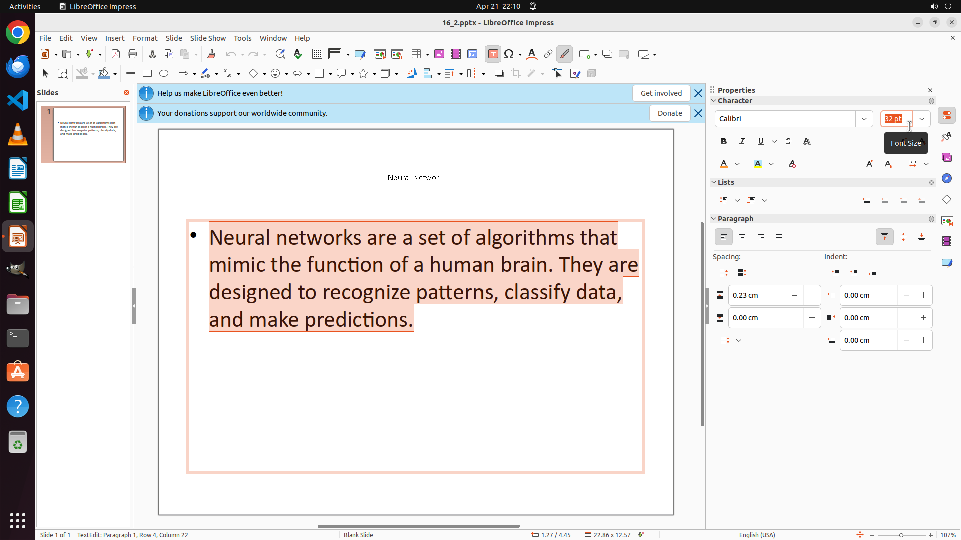 ## 6. 上一次操作的前50步操作简述 ### 步骤 1: - 描述: ``` #### 重要信息 LibreOffice Impress is open with a presentation containing a slide titled "Neural Network" with bullet point content. The slide currently has: - White/blank background - Black text - Font size appears larger than 12 The Properties panel is visible on the right showing "Background: None". I need to: 1. Select all text content 2. Change font size to 12 3. Change font color to orange 4. Change slide background to red #### 情况分析与思考过程 To accomplish this task, I need to: 1. First click on the text area to enter edit mode 2. Select all text (Ctrl+A) 3. Change font size to 12 using the toolbar or Format menu 4. Change font color to orange using the font color button 5. Click outside text boxes to select the slide itself 6. Change background to red using the Properties panel Let me start by clicking on the title text to enter edit mode, then select all content. I'll begin with clicking on the title "Neural Network" to activate text editing mode. ``` - 操作: 1. 左键单击坐标 (0.43, 0.329) ### 步骤 2: - 描述: ``` #### 重要信息 LibreOffice Impress is open with a slide containing "Neural Network" title and bullet point text. I've clicked on the title and now I'm in text editing mode (the title text box is active with an orange border). The status bar shows "TextEdit: Paragraph 1, Row 1, Column 8". The current font size is 44 pt as shown in the Properties panel on the right. #### 情况分析与思考过程 I'm now in text editing mode for the title. To accomplish the task, I need to: 1. First select all text in this text box (Ctrl+A) 2. Change font size to 12 3. Change font color to orange 4. Then do the same for the bullet point text 5. Finally change the slide background to red Let me start by selecting all text in the current title text box using Ctrl+A. This will allow me to apply formatting changes to the entire title at once. ``` - 操作: 1. 按下键盘按键: ctrl, a ### 步骤 3: - 描述: ``` #### 重要信息 The title "Neural Network" is now selected (highlighted with darker background). The status bar shows "TextEdit: Paragraph 1, Row 1, Column 15" indicating all text in the title box is selected. The Properties panel on the right shows the current font size is "44 pt" in the Character section. #### 情况分析与思考过程 Good progress! The title text is now selected. Now I need to: 1. Change the font size from 44 pt to 12 2. Change the font color to orange 3. Then select and format the bullet point text 4. Finally change the slide background to red I can see the font size field showing "44 pt" in the Properties panel on the right. I'll click on it and change it to 12. This is more direct than using the Format menu. ``` - 操作: 1. 左键三击坐标 (0.93, 0.22) ### 步骤 4: - 描述: ``` #### 重要信息 The font size field in the Properties panel is now selected (showing "44 pt" highlighted). The title "Neural Network" remains selected in the slide. The font size field is ready for me to type the new value. #### 情况分析与思考过程 Perfect! The font size field is selected. Now I need to: 1. Type "12" to replace the current "44 pt" value 2. Press Enter to apply the change 3. Then change the font color to orange 4. Then select and format the bullet point text 5. Finally change the slide background to red I'll type "12" now to change the font size. ``` - 操作: 1. 输入文本: 12 ### 步骤 5: - 描述: ``` #### 重要信息 The font size field in the Properties panel now shows "12" but the change hasn't been applied yet - the title text still appears large. I need to press Enter to confirm and apply the font size change. The title "Neural Network" remains selected. #### 情况分析与思考过程 I've successfully typed "12" in the font size field. Now I need to press Enter to apply this change. After that, I'll need to: 1. Change the font color to orange 2. Select the bullet point text and apply the same formatting (size 12, orange) 3. Change the slide background to red Pressing Enter now will apply the font size change to the selected title text. ``` I'll press Enter to apply the font size change. - 操作: 1. 按下键盘按键: enter ### 步骤 6: - 描述: ``` #### 重要信息 The font size change has been successfully applied! The title "Neural Network" is now displayed in a much smaller font size (12 pt instead of 44 pt). The title text box remains selected with the orange border. The Properties panel still shows "12 pt" confirming the change. Now I need to: 1. Change the font color to orange for the selected title text 2. Select and format the bullet point text with the same settings (size 12, orange) 3. Change the slide background to red I can see in the Properties panel on the right there's a font color button (the "A" with a colored underline) in the Character section. I need to click on the dropdown arrow next to it to open the color picker. #### 情况分析与思考过程 The title text is still selected, which is perfect for applying the font color change. I can see the font color button in the Properties panel's Character section. It shows an "A" with what appears to be a red/orange underline and a dropdown arrow next to it. I should click on the dropdown arrow to open the color palette where I can select orange. After changing the title color to orange, I'll need to: 1. Click on the bullet point text to select it 2. Select all text in that text box (Ctrl+A) 3. Change its font size to 12 4. Change its color to orange 5. Finally, change the slide background to red Let me click on the font color dropdown arrow in the Properties panel to open the color picker. ``` - 操作: 1. 左键单击坐标 (0.768, 0.301) ### 步骤 7: - 描述: ``` #### 重要信息 The font color picker dropdown is now open, showing a color palette with many colors. The title "Neural Network" is still selected. I can see various colors in the palette includin