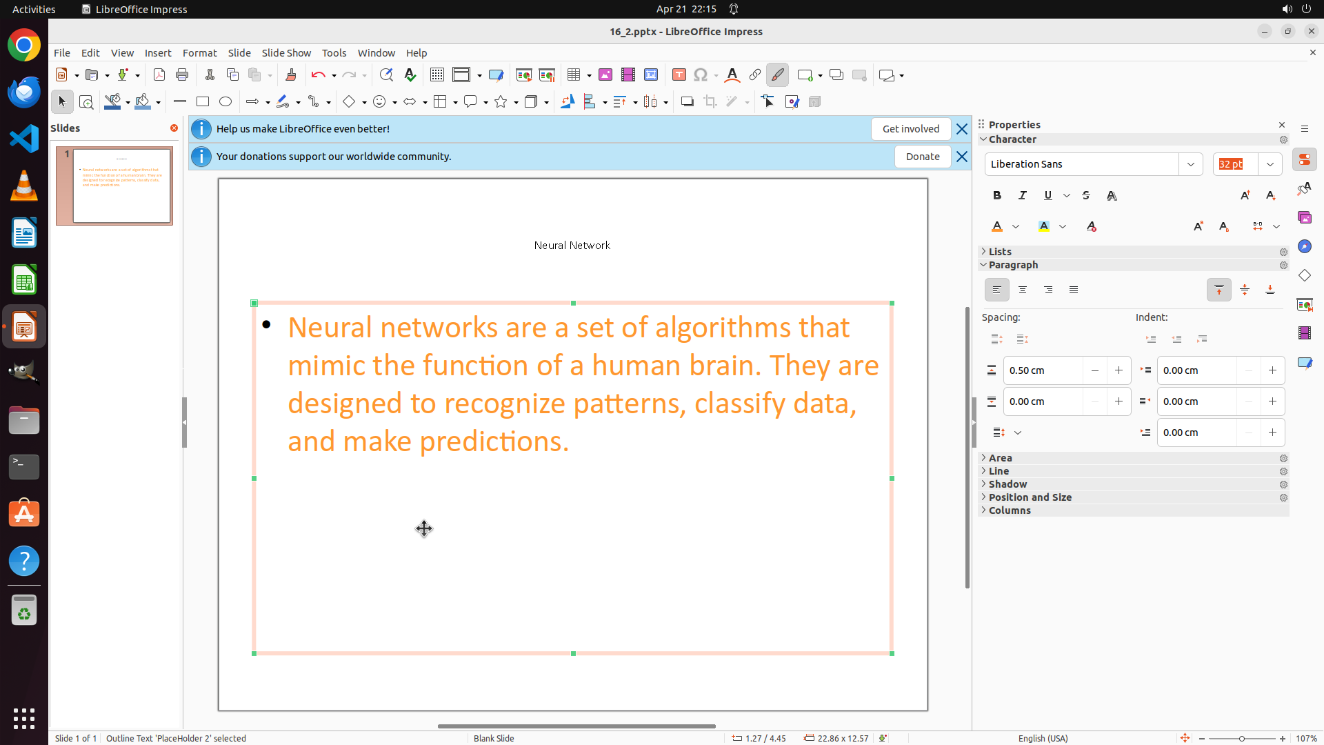 The text box is currently in edit mode (status bar shows "TextEdit: Paragraph 2, Row 2, Column 1"). The text box has an orange/peach border showing it's selected. The title "Neural Network" is visible at the top in orange color at size 12. I can see a bullet point (•) in the text box but the actual text content is not clearly visible - it may be at size 12 but needs to be selected and colored orange. The Properties panel shows font size "12 pt". The slide background is still white.