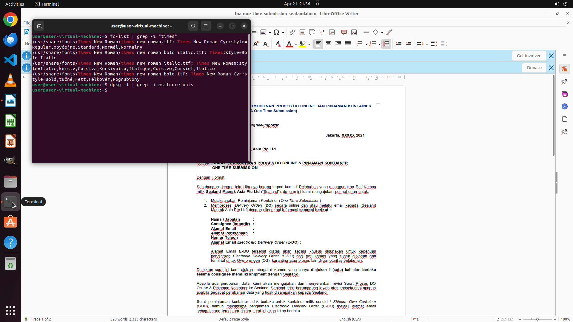 ## 4. 上一次操作的前 5 步操作简述 ### 步骤 1: - 描述: ``` #### 从截图中观察到的信息 当前屏幕显示: - LibreOffice Writer 已打开,正在编辑一个文档 "loa-one-time-submission-sealand.docx" - 当前字体设置为 Arial,字号 11pt - 文档内容是印尼语的商业信函格式 - 左侧边栏显示终端图标可用 - 系统为 Ubuntu Linux(从顶部栏可见) 需要回答的问题: 1. Times New Roman 字体是否已安装(需运行 fc-list | grep -i "times") 2. 哪些应用需要 Times New Roman 作为默认字体 3. msttcorefonts 包是否已安装(需运行 dpkg -l | grep -i msttcorefonts) #### 下一步计划 需要打开终端运行命令来检查字体安装情况。点击左侧边栏的终端图标打开终端,然后执行相关命令。 我将同时执行打开终端和准备输入命令的操作。 ``` - 操作: 1. 左键单击坐标 (0.018, 0.623) </SITUATION>