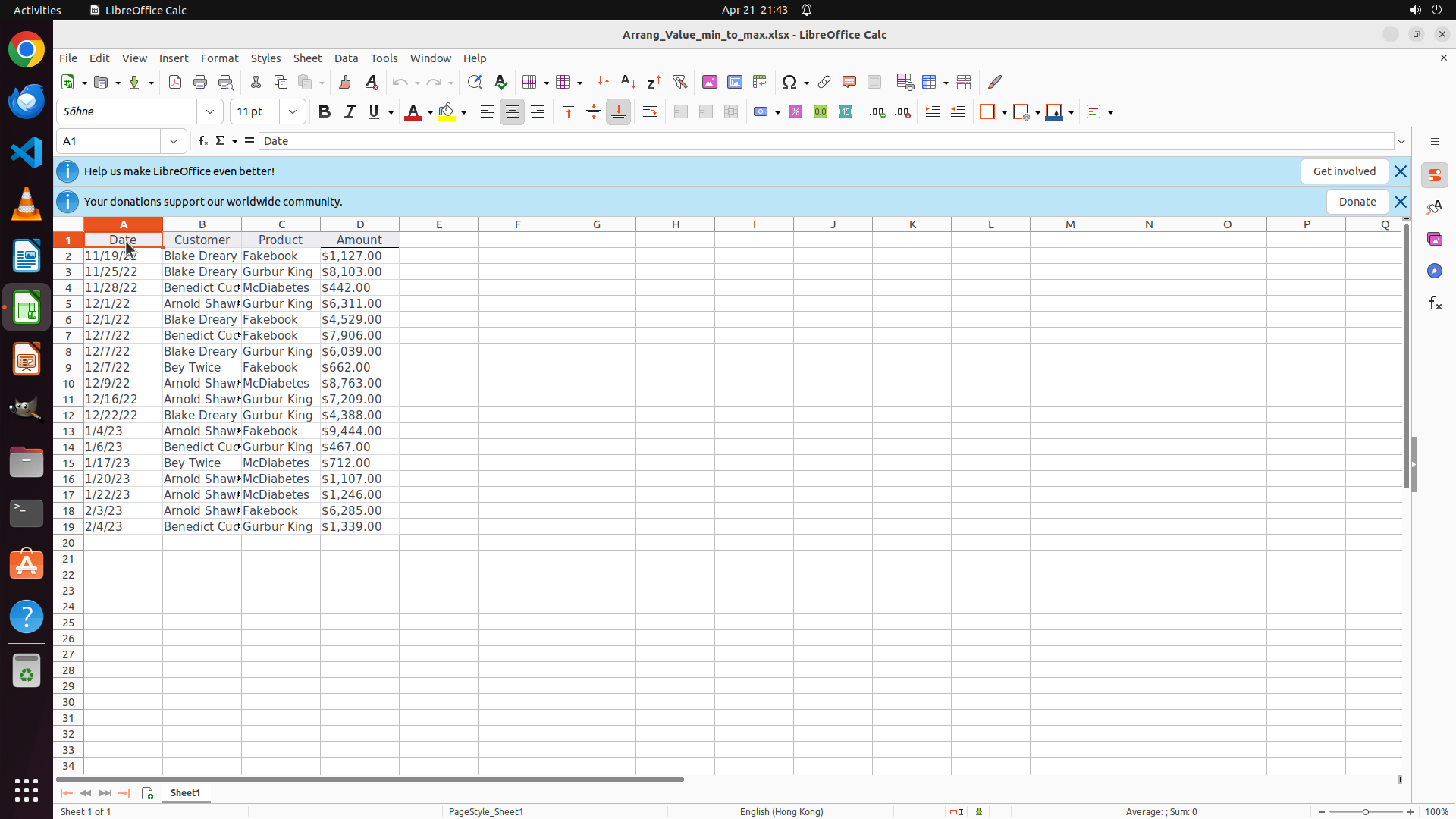 - LibreOffice Calc is open with a spreadsheet containing data in columns A (Date), B (Customer), C (Product), and D (Amount).