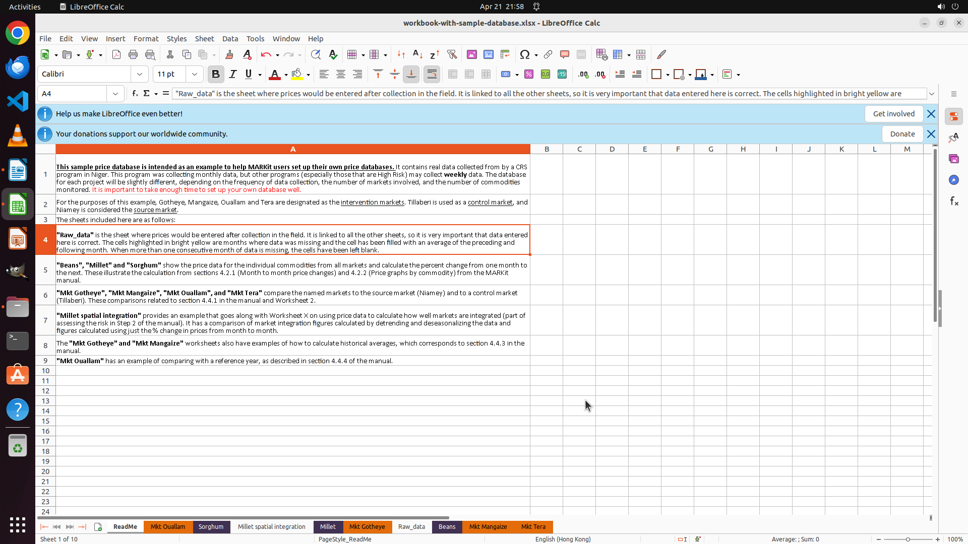 - Calc 文件底部工作表标签栏从左到右依次显示:ReadMe, Raw_data, Beans, Millet, Sorghum, Mkt Gotheye, Mkt Magaize, Mkt Ouallam, Mkt Tera, Millet spatial integration