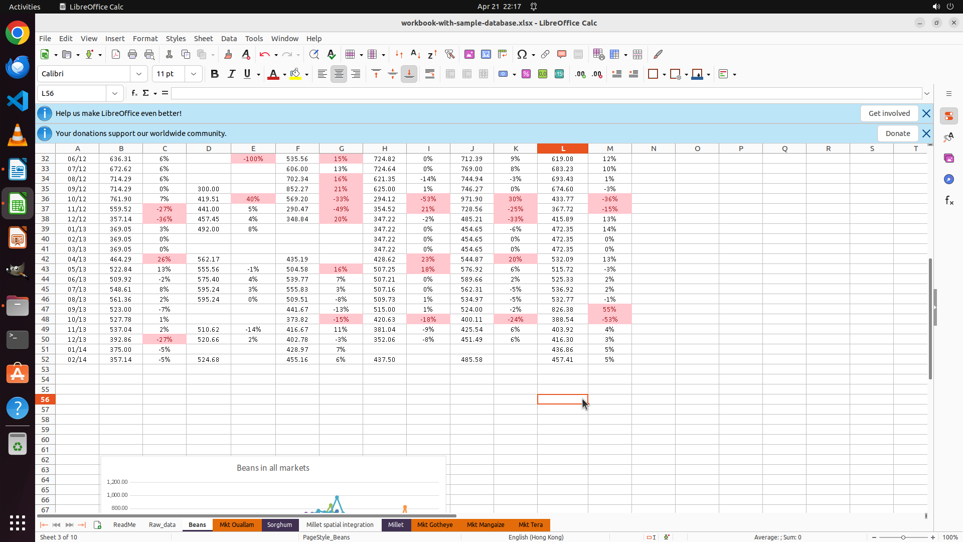 - LibreOffice Calc 窗口已打开,显示 workbook-with-sample-database.xlsx 文件