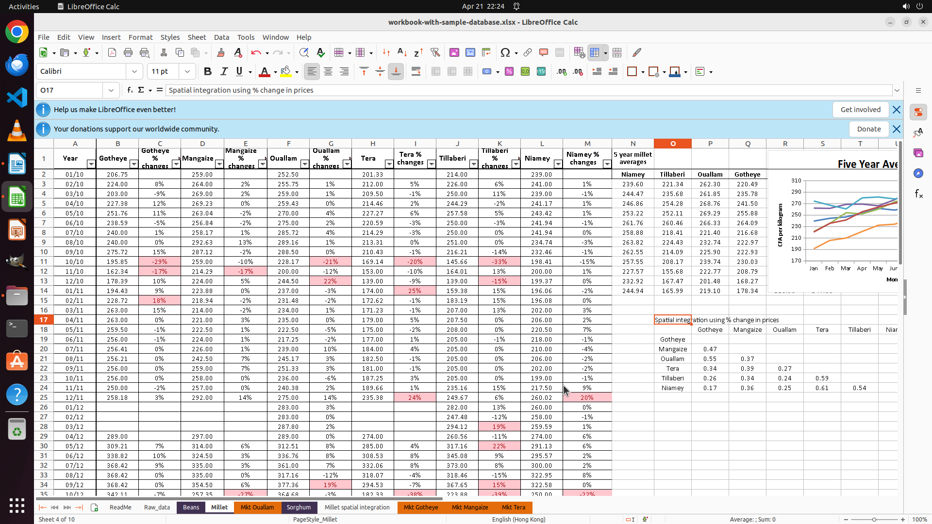 - 当前工作表顺序:ReadMe (1), Raw_data (2), Mkt Ouallam (3), Sorghum (4), Millet spatial integration (5), Millet (6), Mkt Gotheye (7), Beans (8), Mkt Magaize (9), Mkt Tera (10)