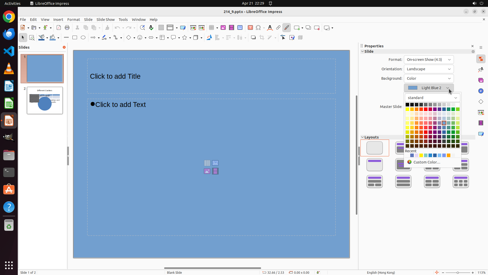 ## 6. 上一次操作的前50步操作简述 ### 步骤 1: - 描述: ``` #### 重要信息 - LibreOffice Impress is open with a presentation file "214_9.pptx" - Slide 1 is already selected in the left panel (highlighted with orange border) - The main canvas shows slide 1 with a white background - The Properties panel on the right shows "Background: None" with a dropdown - There are notification banners at the top that might interfere with the interface #### 情况分析与思考过程 The task is to move to slide 1 and give it a green background color. Currently: - I'm already on slide 1 (it's selected in the left panel) - The background is currently white/None To change the background to green, I need to: 1. First, close the notification banners to have a cleaner workspace 2. Click on the "Background" dropdown in the Properties panel (currently showing "None") 3. Select a green color option Let me start by closing the notification banners, then access the background settings. ``` - 操作: 1. 左键单击坐标 (0.725, 0.17) 2. 左键单击坐标 (0.725, 0.17) ### 步骤 2: - 描述: ``` #### 重要信息 - LibreOffice Impress is open with presentation "214_9.pptx" - Slide 1 is selected (highlighted with orange border in left panel) - The Properties panel on the right shows "Background: None" with a dropdown menu - The main canvas shows slide 1 with a white background - No notification banners are visible (they may have been closed or weren't there) #### 情况分析与思考过程 The previous action attempted to close notification banners, but I don't see any change - the interface looks the same. However, this doesn't prevent me from proceeding with the main task. To change the slide background to green: 1. I need to click on the "Background" dropdown in the Properties panel (currently showing "None") 2. This should reveal background options including color choices 3. Select green color Looking at the Properties panel on the right, I can see the "Background:" field with "None" displayed and a dropdown arrow. Clicking on this dropdown should open the background options where I can select a color. Let me click on the Background dropdown to access the background settings. ``` - 操作: 1. 左键单击坐标 (0.877, 0.283) ### 步骤 3: - 描述: ``` #### 重要信息 - The Background dropdown menu is now open showing options: None, Color, Gradient, Hatching, Bitmap, Pattern - "None" is currently selected (highlighted in orange) - Slide 1 is still selected in the left panel - The main canvas still shows a white background #### 情况分析与思考过程 The previous action successfully opened the Background dropdown menu. Now I can see the available background options. To set a green background color, I need to: 1. Click on "Color" from the dropdown menu 2. This should open a color picker where I can select green The "Color" option is visible in the dropdown menu below "None". Clicking on it should allow me to access color selection options. ``` - 操作: 1. 左键单击坐标 (0.85, 0.331) </SITUATION>