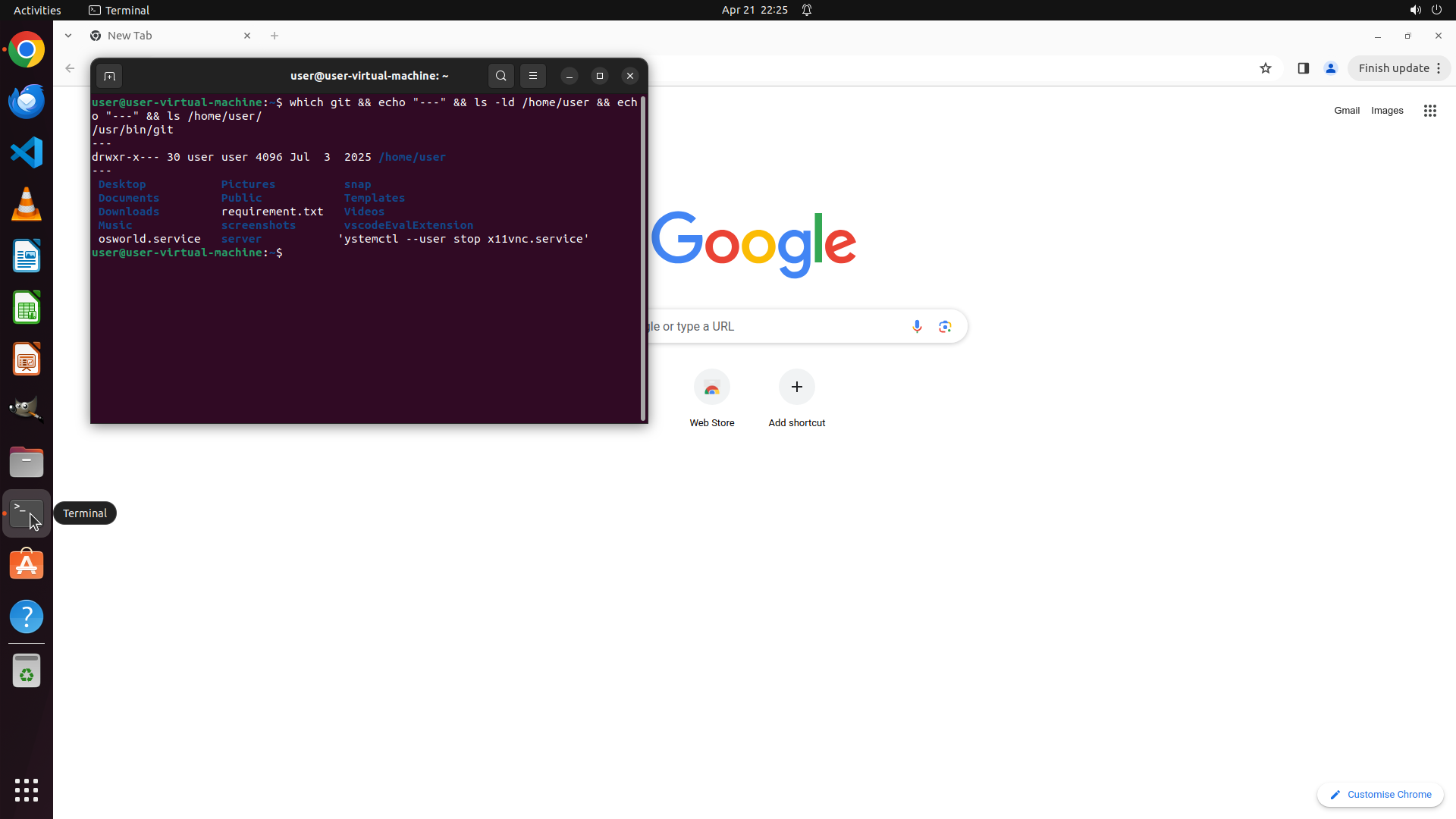 ## 4. 上一次操作的前 5 步操作简述 ### 步骤 1: - 描述: ``` #### 从截图中观察到的信息 当前屏幕显示的是 Ubuntu 桌面,Google Chrome 浏览器已打开显示 Google 首页。左侧有一个垂直的应用程序启动栏(dock),其中包含多个应用图标,包括: - Chrome 浏览器(顶部) - VS Code(蓝色图标) - 终端(黑色图标,看起来像一个命令行窗口) - 文件管理器 - 其他应用程序 右上角显示时间为 "Apr 21 22:23",还有系统托盘图标。 需要回答三个问题: 1. Git 是否已安装 2. /home/user 目录是否存在且可写 3. /home/user 下是否已存在 'instructor-embedding' 目录 我需要在终端中运行命令来检查这些信息。 #### 下一步计划 1. 点击左侧 dock 中的终端图标打开终端 2. 在终端中运行命令检查 git 安装、目录存在性和权限 3. 根据结果填写所有三个问题的答案 由于这是第一步操作,我将打开终端。 ``` - 操作: 1. 左键单击坐标 (0.018, 0.622) </SITUATION>