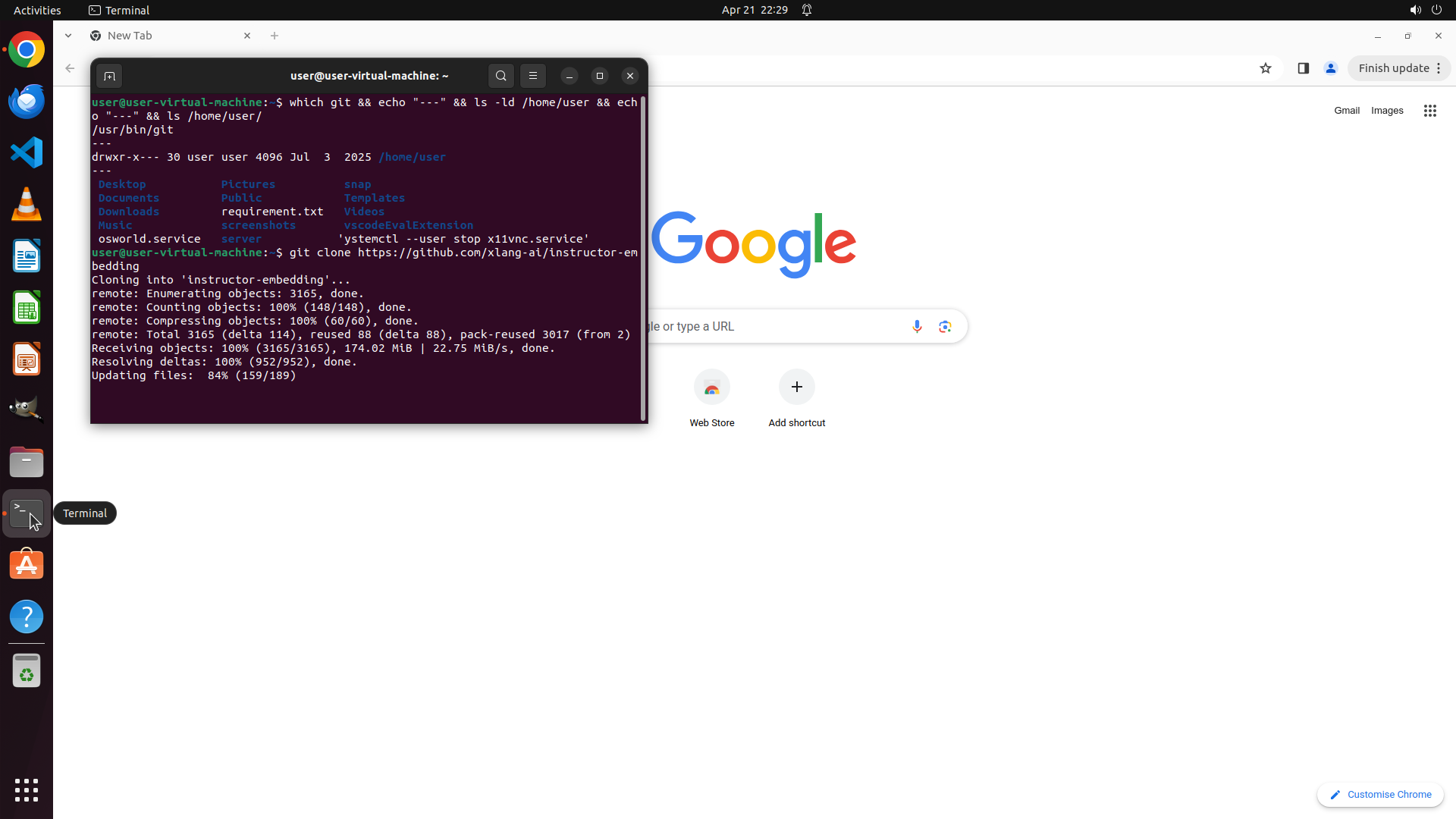## 6. 上一次操作的前50步操作简述 ### 步骤 1: - 描述: ``` #### 重要信息 - 终端已经打开并处于活动状态 - Git 已安装(路径显示为 /usr/bin/git) - /home/user 目录存在且可写(权限 drwxr-x---,属于 user 用户) - 当前目录列表中还没有 instructor-embedding 目录 - 终端提示符显示为 `user@user-virtual-machine:~$`,表示当前在 /home/user 目录 #### 情况分析与思考过程 当前状态很好,所有前置条件都已满足: 1. ✓ Git 已安装 2. ✓ /home/user 目录存在且可写 3. ✓ 终端已打开并处于 /home/user 目录 接下来我需要执行 git clone 命令来克隆仓库。由于终端已经打开并且光标在命令提示符处,我可以直接输入 git clone 命令。这是一个简单的操作,不需要批量处理,直接输入命令即可。 执行命令后,我需要等待克隆完成,然后验证仓库是否成功克隆。 ``` - 操作: 1. 输入文本: git clone https://github.com/xlang-ai/instructor-embedding </SITUATION>