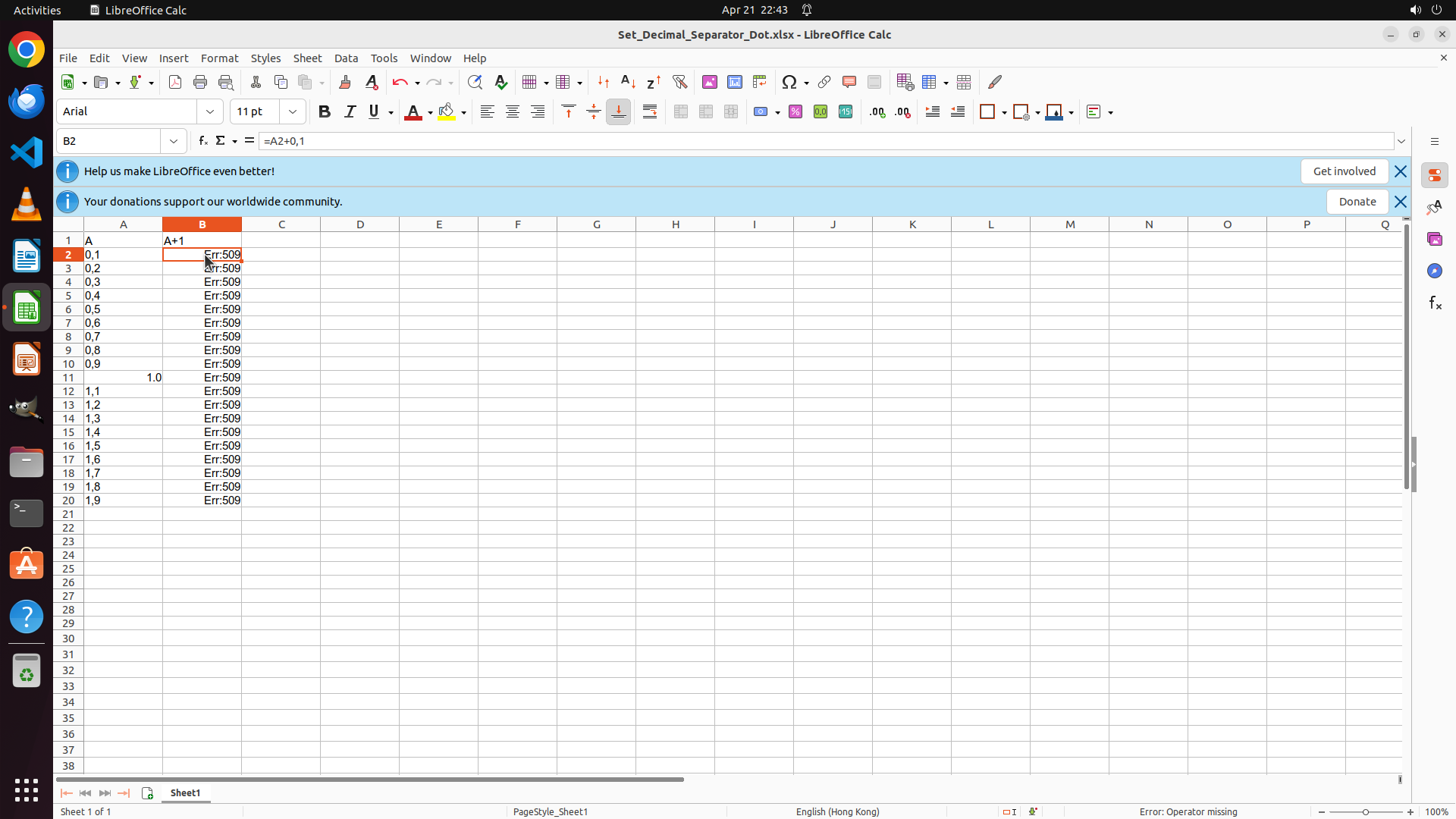 Looking at the header "A+1" for column B, this suggests column B likely contains formulas that reference column A (like =A2+1, =A3+1, etc.). The "Err:509" error typically indicates a missing operator in formulas.