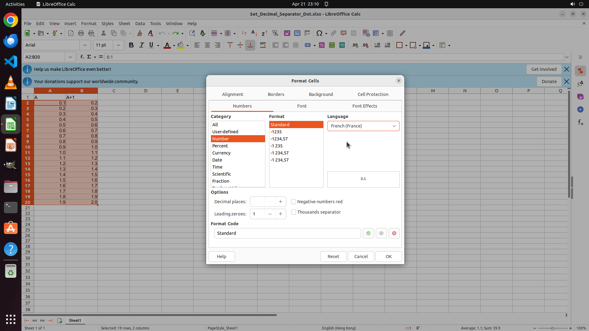 Now I'll select the range A2:B20 and then open the Format Cells dialog to properly set the decimal separator to comma while keeping the values as numbers.