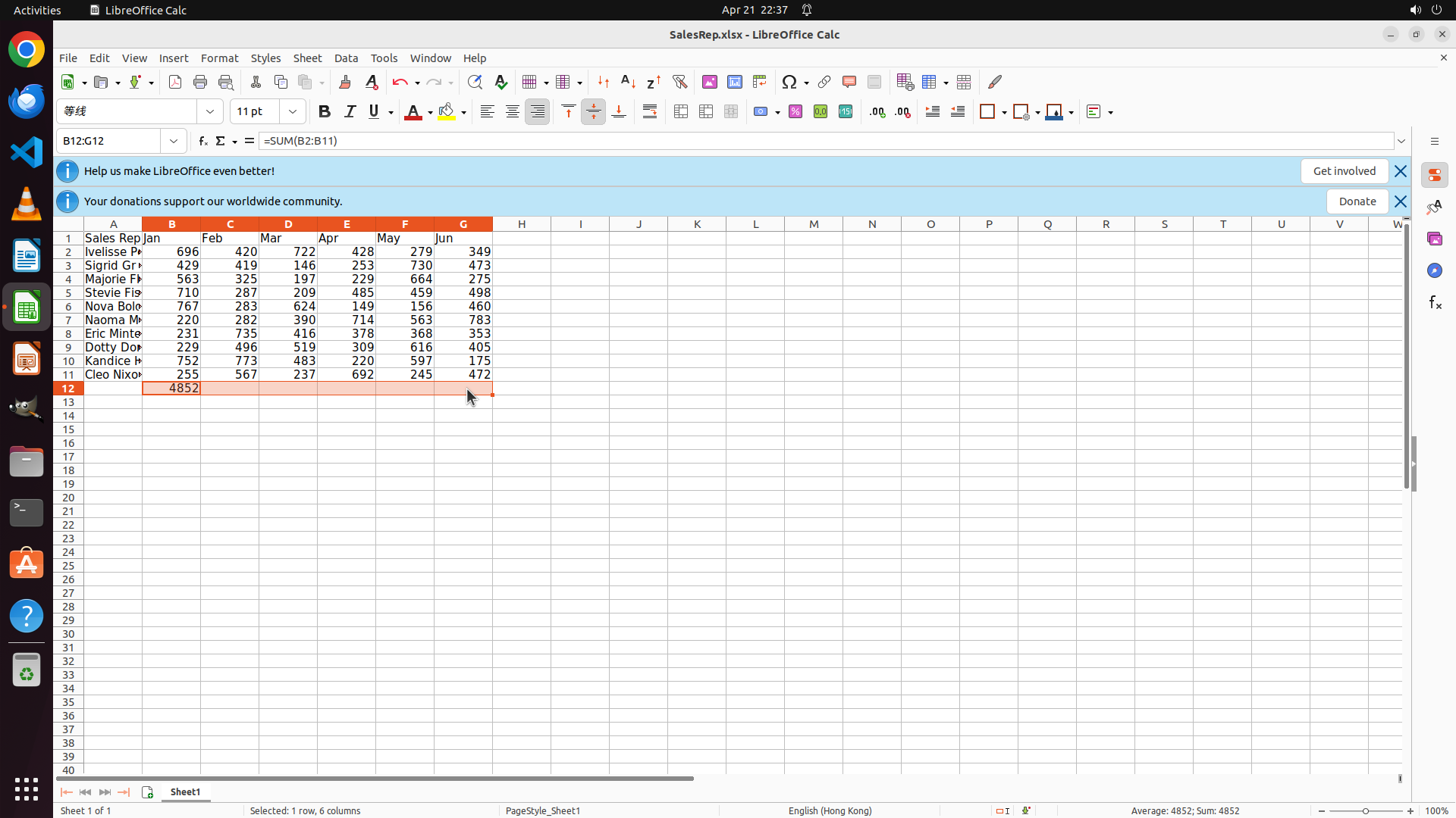 - Only cell B12 currently has the value 4852; cells C12:G12 appear empty and need the formula filled