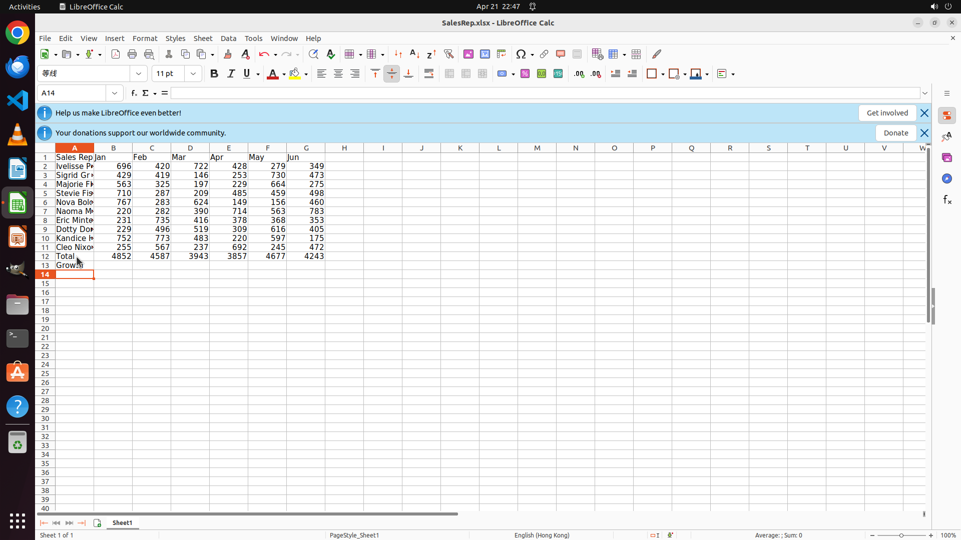 你的任务是:借助工具,来操作一台电脑来达成任务: Calculate the total sales in an underneath row called "Total" and display the total of each month as bars. Then calculate the month-on-month growth percentage for Feb to Jun in another row called "Growth" and show them in a line chart (Jan should be omitted in the chart as well). Set the chart titles as the two row headers respectively.。