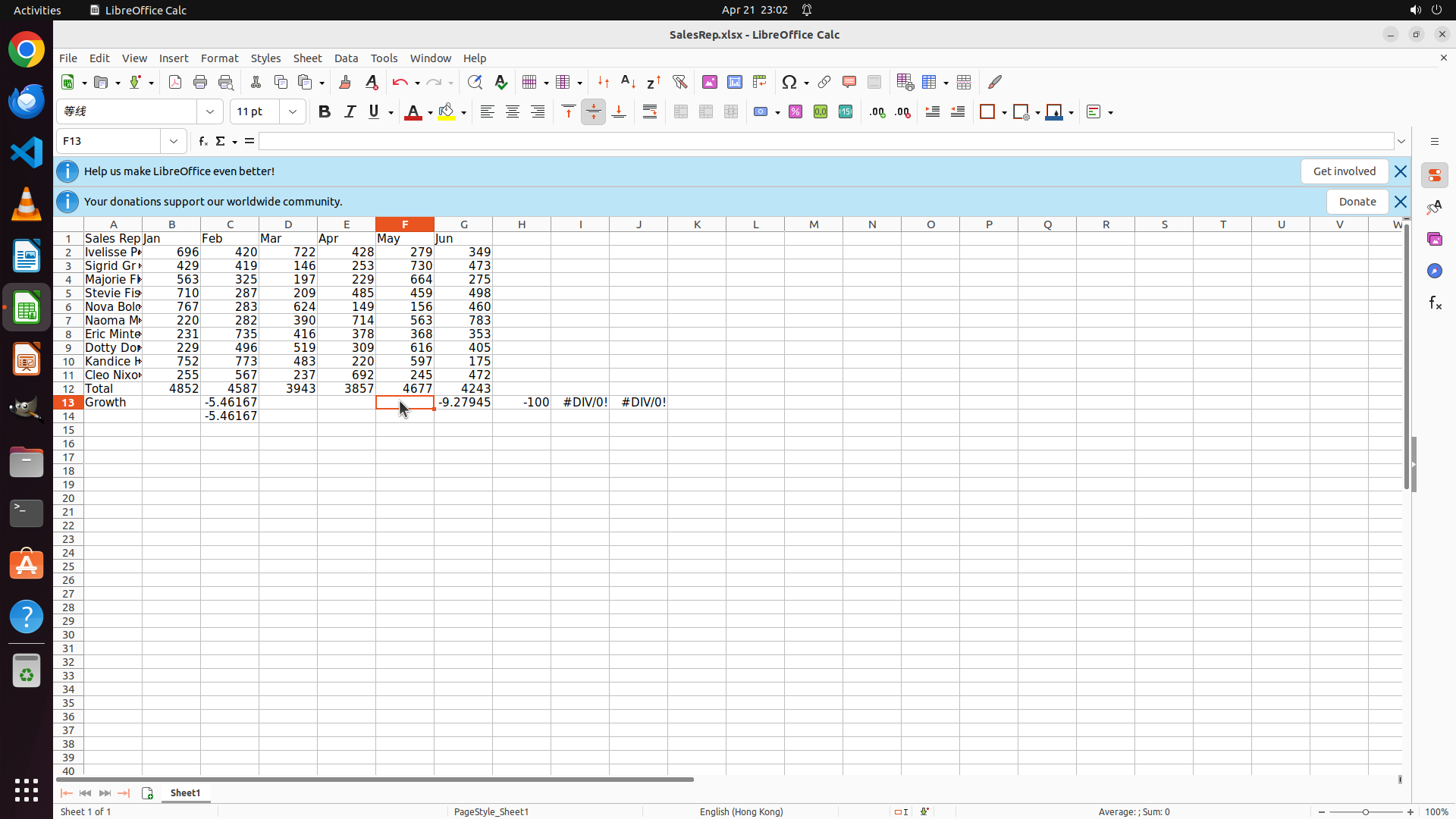 - However, I can see there are #DIV/0! errors in F13 and G13