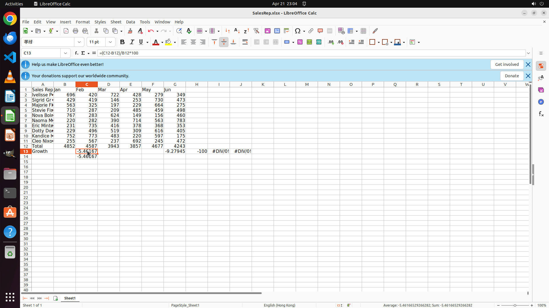 - The growth values visible are: -5.46167, -9.27945, -100, #DIV/0!, #DIV/0!