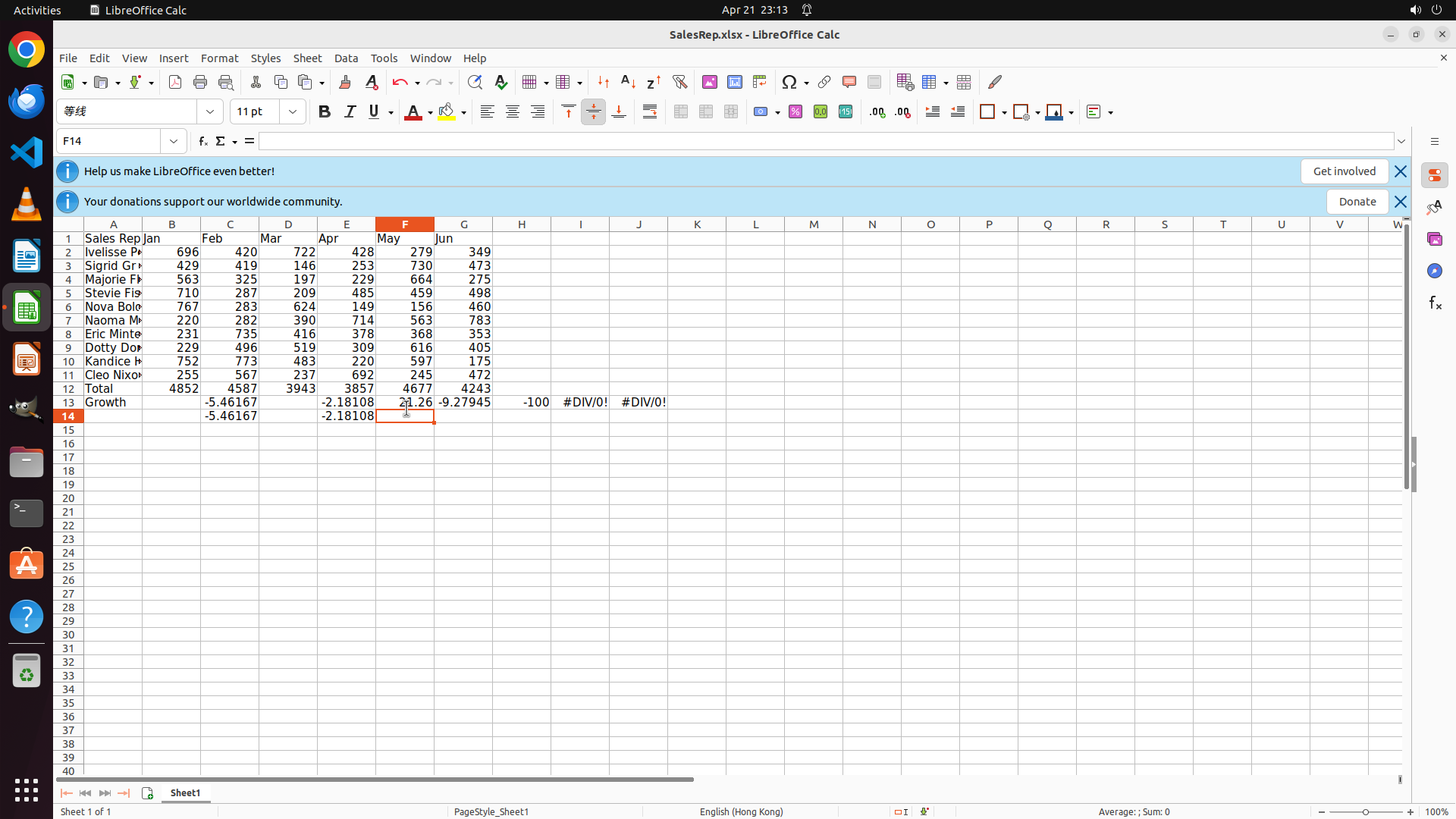 Now I need to fix F13 (May growth) and G13 (June growth). Let me click on F13 to check and fix its formula. It should be =(F12-E12)/E12*100.