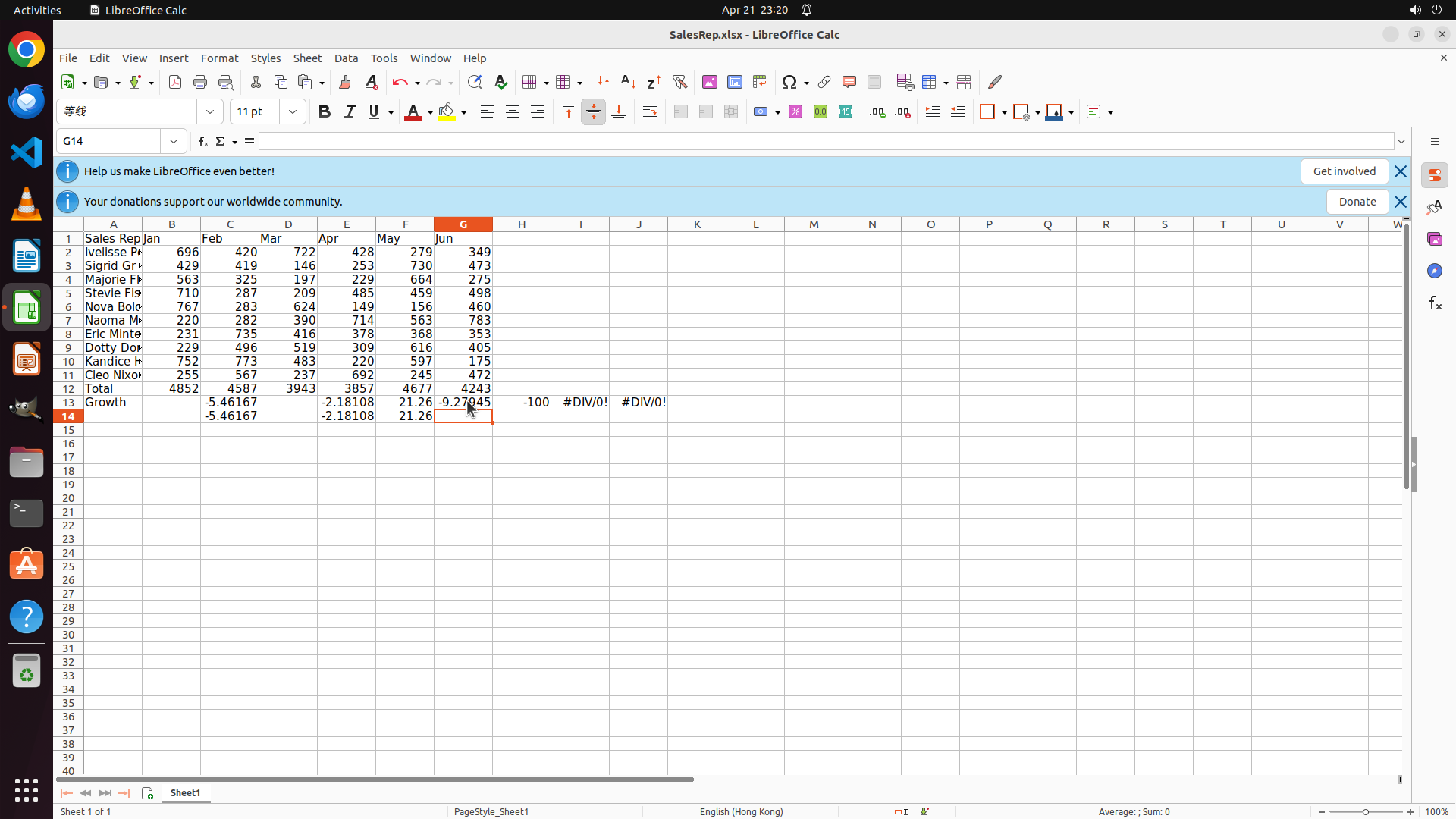 - G13 shows #DIV/0! which also needs fixing with =(G12-F12)/F12*100