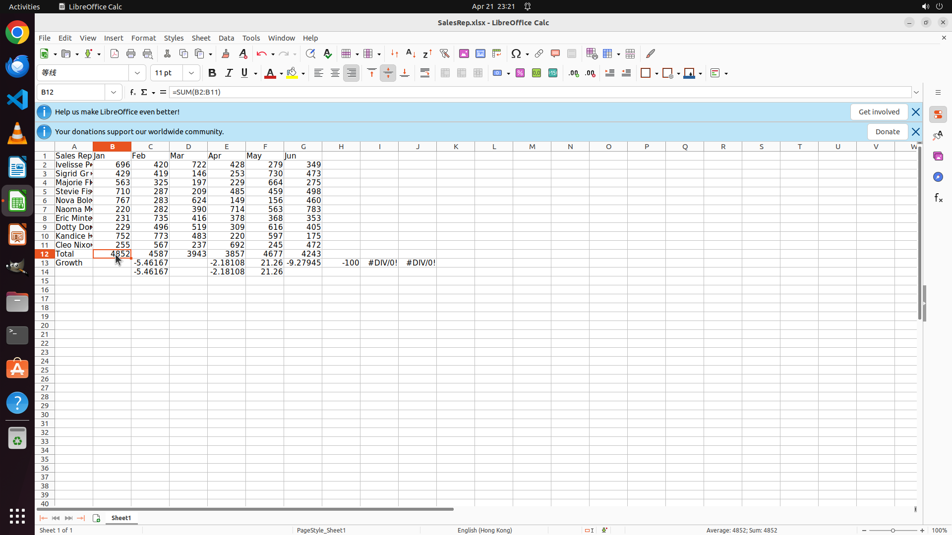 - G13 shows #DIV/0! (needs formula =(G12-F12)/F12*100)