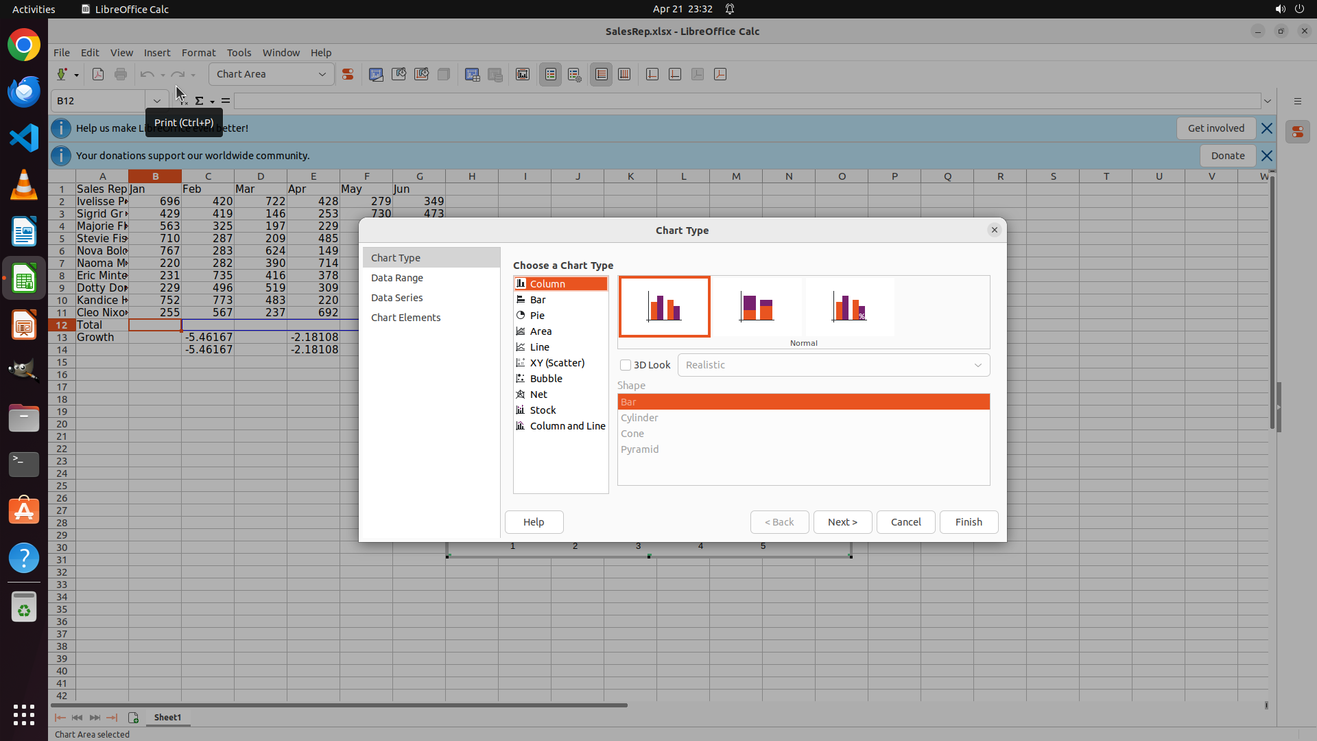 Let me drag from B12 to G12 to select the range for the bar chart.