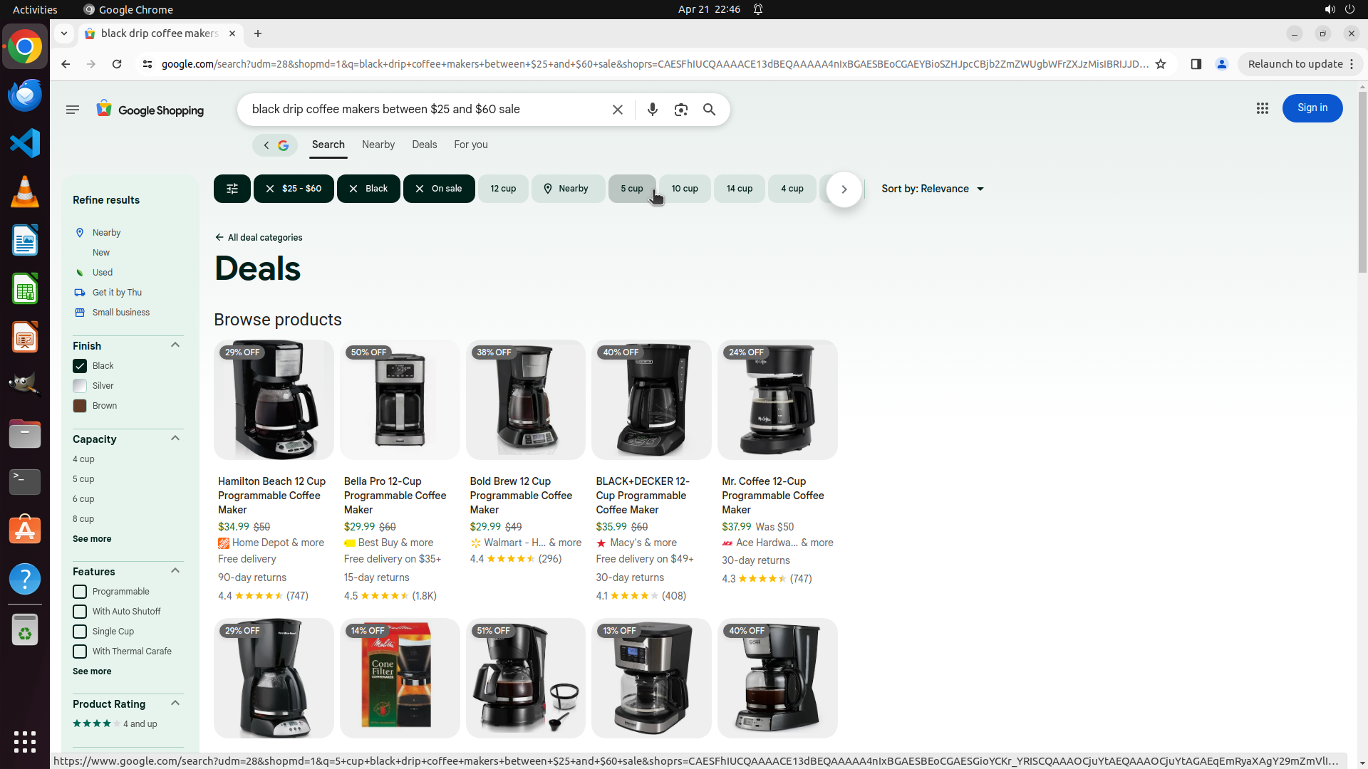 - Product results display drip coffee makers with black finish visible in product images