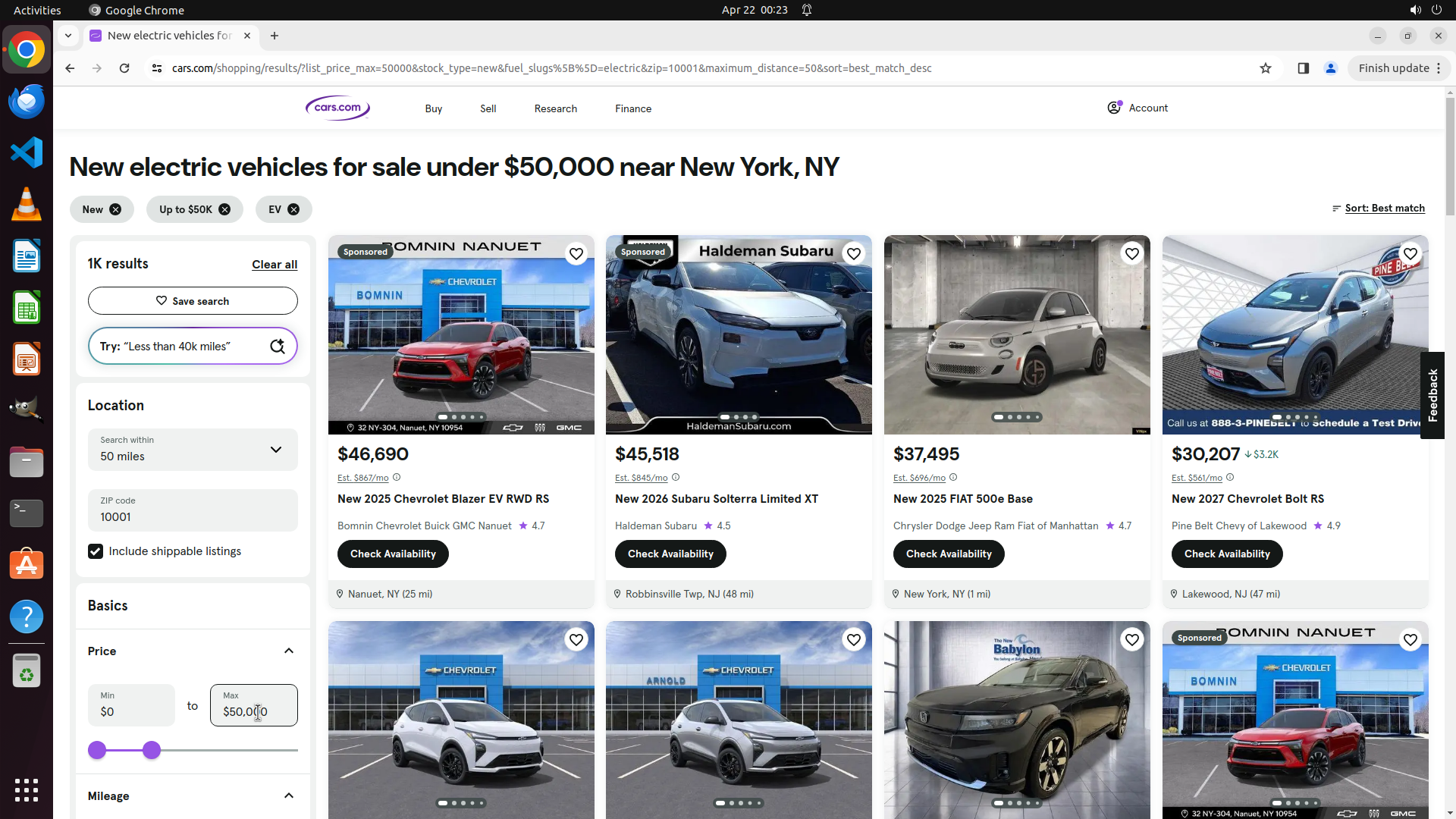 你的任务是:借助工具,来操作一台电脑来达成任务: Find electric cars with a maximum price of $50,000 within 50 miles of 10001.。