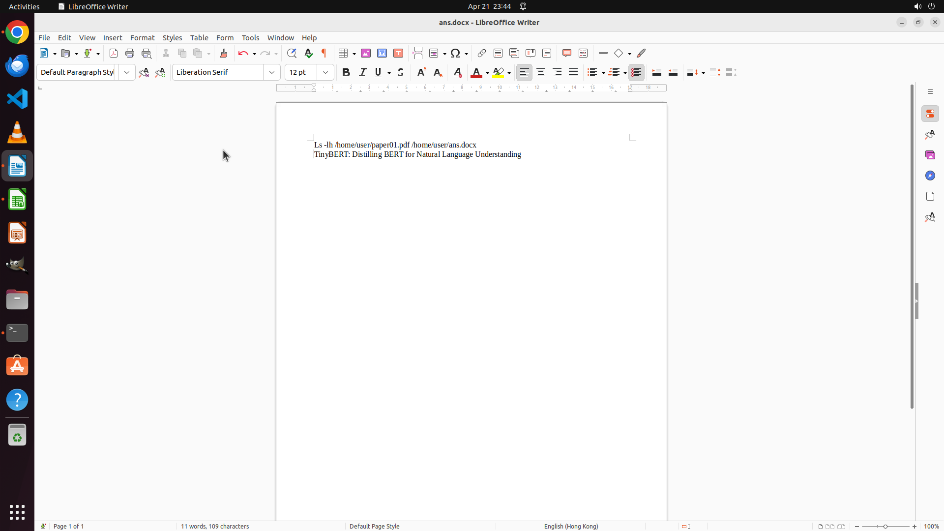 1. 输入文本: python3 -c "from docx import Document; doc = Document(); doc.add_paragraph('TinyBERT: Distilling BERT for Natural Language Understanding'); doc.save('/home/user/ans.docx')",并按回车提交