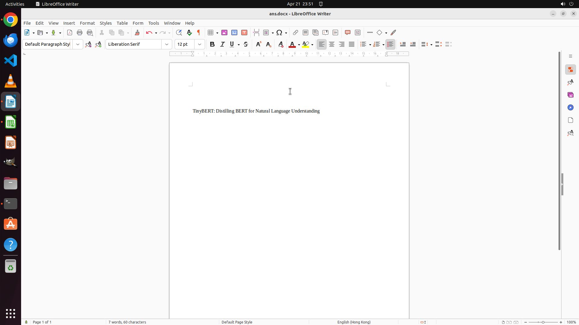 - LibreOffice Writer 文档已成功保存,标题栏显示 "ans.docx - LibreOffice Writer"