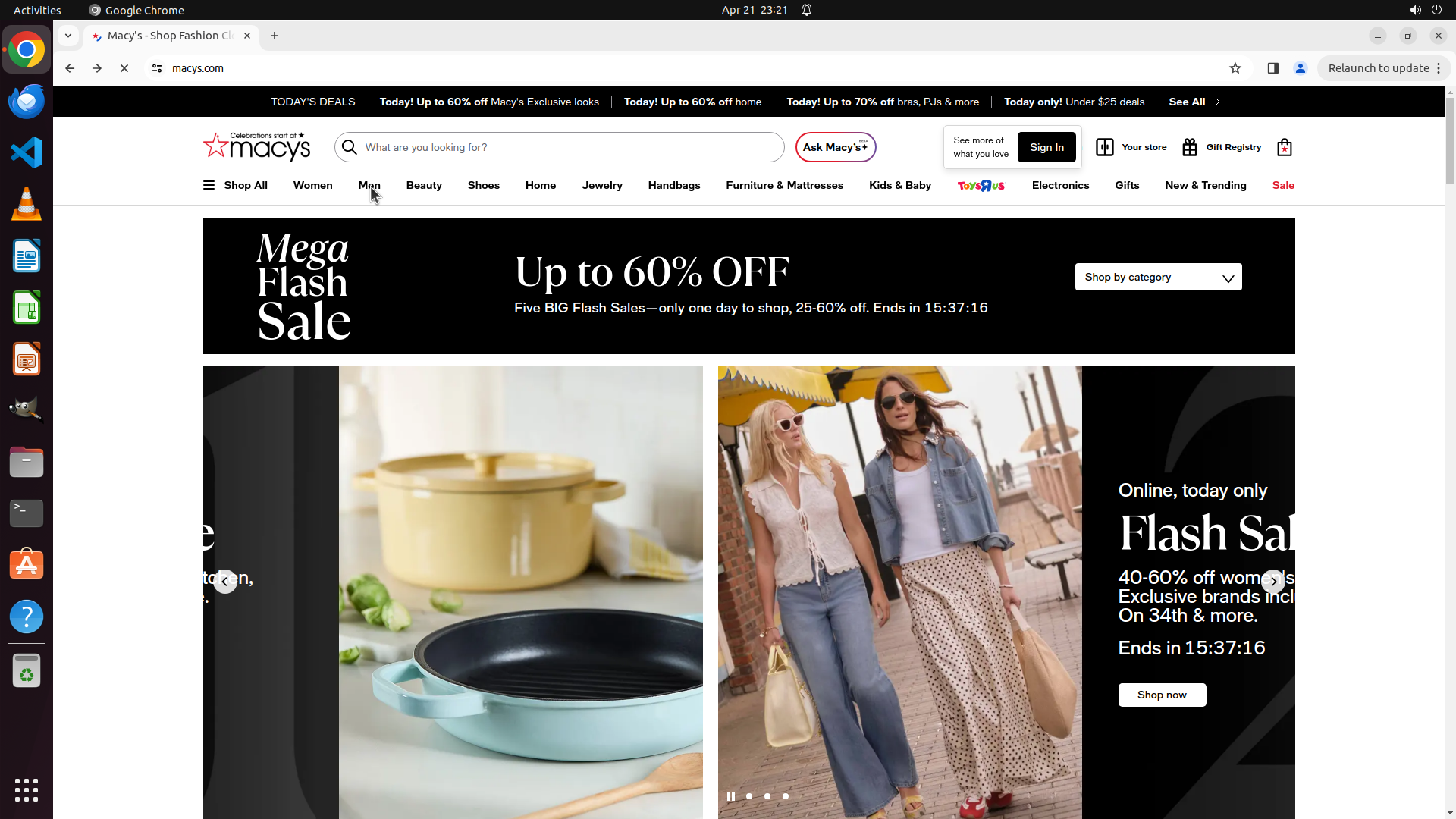 ## 6. 上一次操作的前50步操作简述 ### 步骤 1: - 描述: ``` #### 重要信息 当前屏幕显示Macy's官网首页,顶部导航栏清晰可见,包含"Men"选项。页面正在展示促销活动(Mega Flash Sale)。浏览器地址栏显示macy's.com,网站可正常访问。 #### 情况分析与思考过程 任务目标是展示所有男士大码短袖衬衫(折扣50%或以上)。根据策略树,我需要: 1. 先导航到男士服装区(点击顶部导航栏的"Men") 2. 选择衬衫或短袖衬衫类别 3. 应用大码(Large/L)筛选 4. 应用50%或以上折扣筛选 当前状态是Macy's首页已加载,我应该从第一步开始:点击"Men"进入男士服装区。这是一个明确的起点,点击后会展开男士服装的下拉菜单或进入男士专区页面。 ``` - 操作: 1. 鼠标移动到坐标 (0.252, 0.223) 2. 左键单击坐标 (0.252, 0.223) </SITUATION>