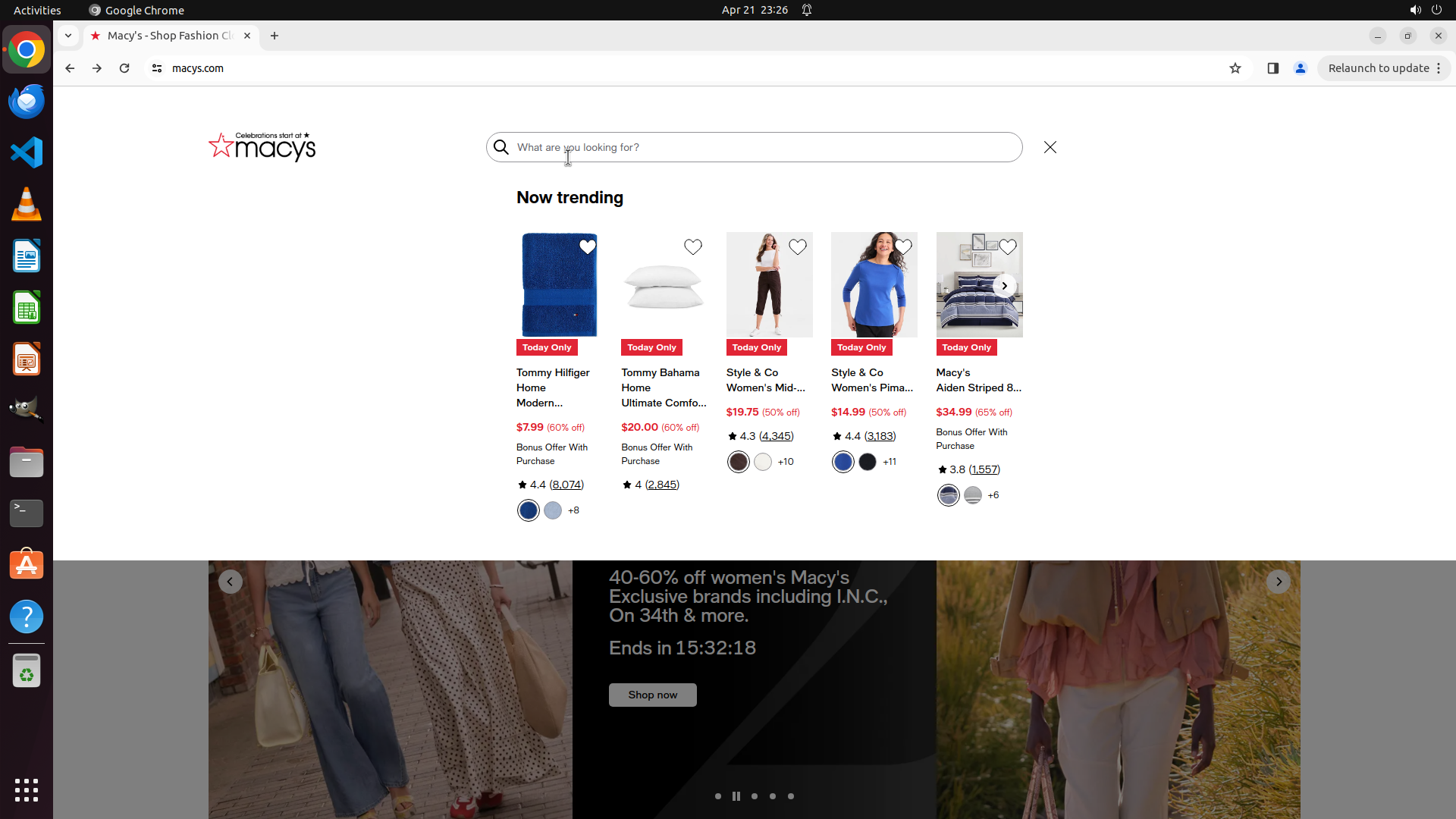 当前屏幕显示Macy's首页,搜索栏已激活(显示光标),但搜索框中仍显示"What are you looking for?"占位文字,没有看到输入的搜索词。下方的"Now trending"推荐商品区域仍然显示,页面未跳转到搜索结果页。这表明之前的文本输入可能未成功执行。