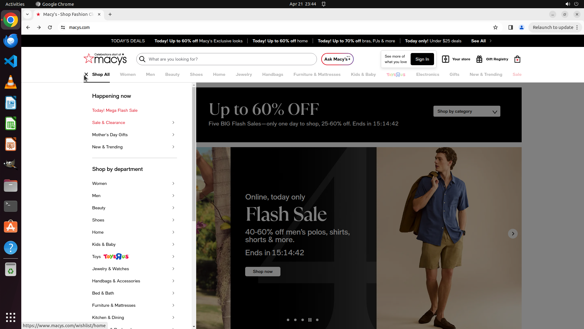 右侧主内容区显示"Up to 60% OFF" Flash Sale促销横幅,特别提到"40-60% off men's polos, shirts, shorts & more"。