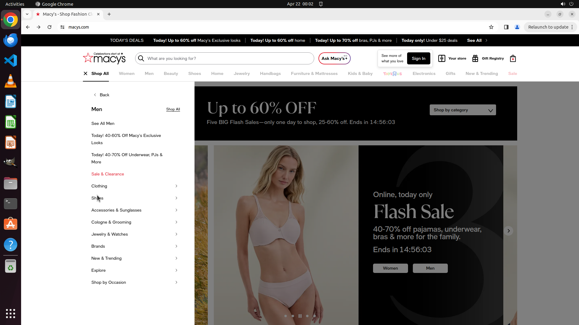 当前屏幕显示Macy's网站,Shop All菜单已打开,Men分类已展开。左侧菜单显示: