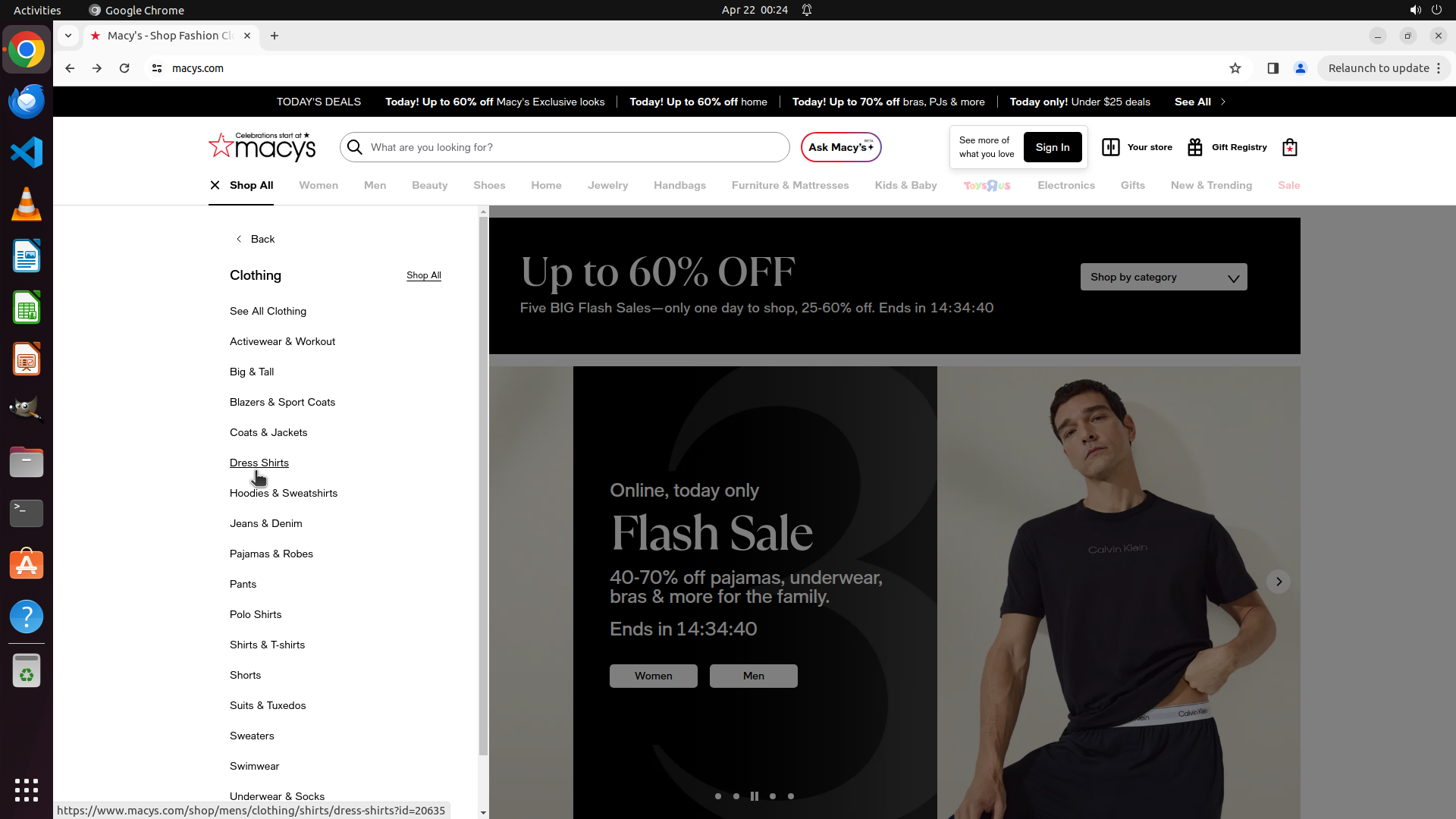 右侧主内容区显示"Up to 60% OFF" Flash Sale促销横幅,特别提到"40-70% off pajamas, underwear, bras & more for the family",下方有"Women"和"Men"按钮。