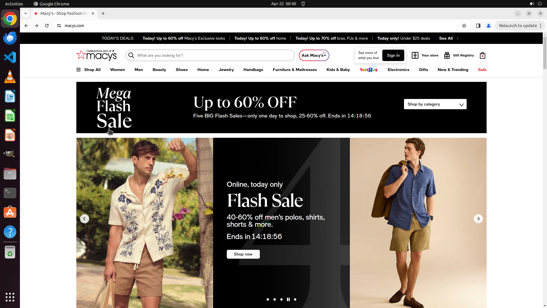 当前屏幕显示Macy's官网首页,成功从"Access Denied"错误页面返回。页面显示"Mega Flash Sale"促销横幅(高达60%折扣),顶部有"TODAY'S DEALS"促销横幅。