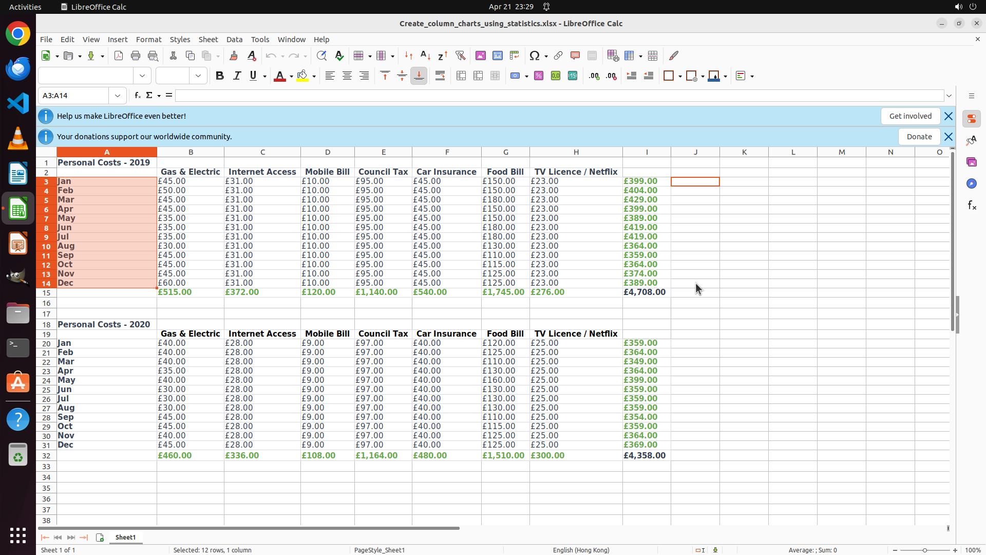 - LibreOffice Calc 已打开,显示个人成本数据表格