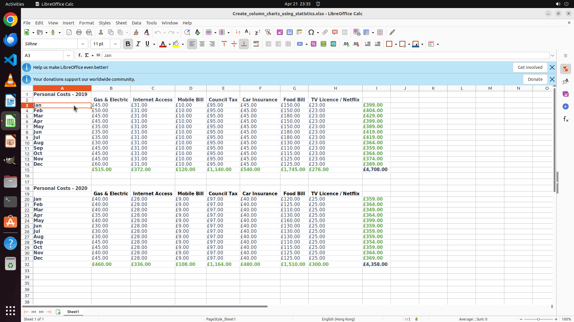 - LibreOffice Calc 已打开,显示个人成本数据表格