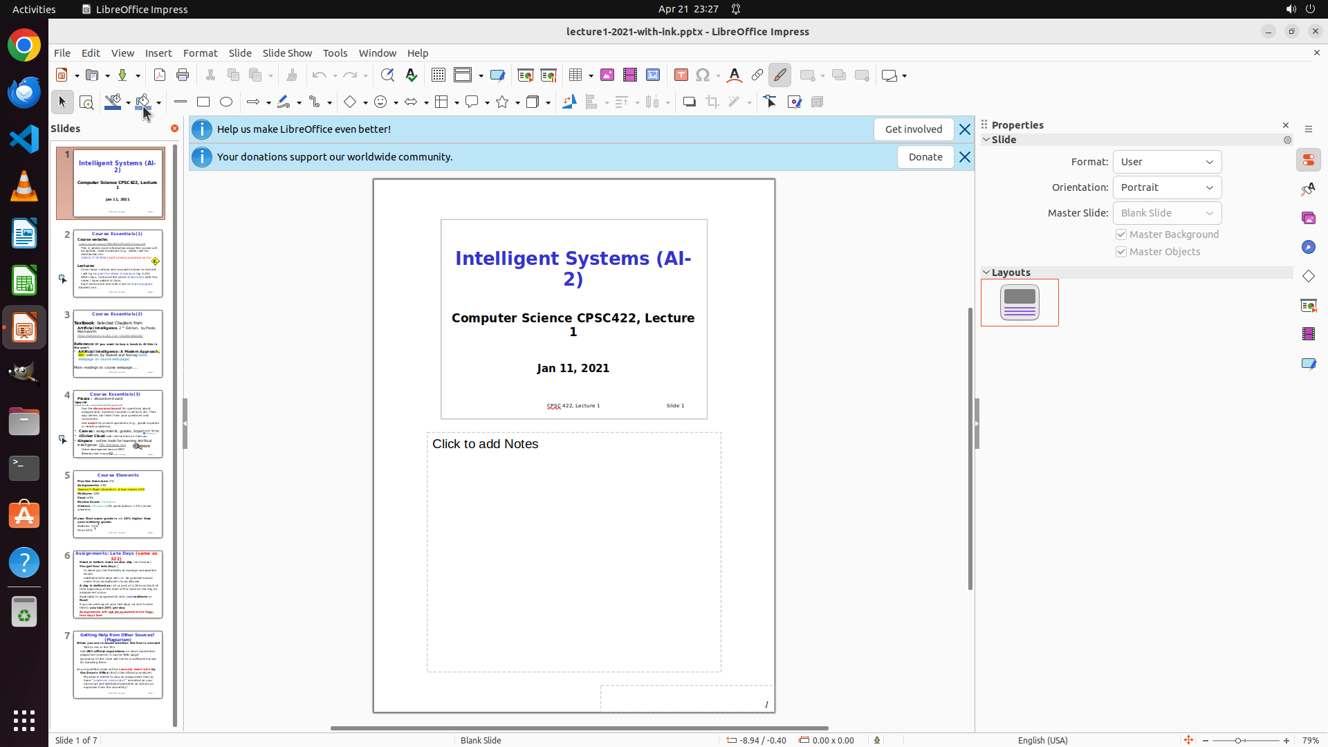 ## 4. 上一次操作的前 5 步操作简述 ### 步骤 1: - 描述: ``` #### 从截图中观察到的信息 当前屏幕显示 LibreOffice Impress 已打开,文件名为 "lecture1-2021-with-ink.pptx"。这是一个关于"Intelligent Systems (AI-2)"的演示文稿,属于 Computer Science CPSC422, Lecture 1,日期为 Jan 11, 2021。 LibreOffice Impress 界面信息: - 当前显示第 1 张幻灯片(共 7 张,底部显示 "Slide 1 of 7") - 左侧有幻灯片缩略图面板,显示 7 张幻灯片的编号(1-7) - 顶部菜单栏包含:File, Edit, View, Insert, Format, Slide, Slide Show, Tools, Window, Help - 当前处于普通编辑视图,非备注视图 - 右侧有 Properties 面板和 Layouts 选项 待回答问题中,LibreOffice Impress 中备注(Notes)功能的位置和访问方式可以通过 View 菜单来查找。同时需要查看桌面上的文件,特别是包含演讲稿/备注的文件。 #### 下一步计划 1. 点击 View 菜单,查找 Notes/备注功能的访问方式 2. 打开文件管理器查看桌面上的文件 3. 通过这些操作收集足够信息来回答多个问题 ``` - 操作: 1. 左键单击坐标 (0.092, 0.068) 2. 等待 1 秒 </SITUATION>