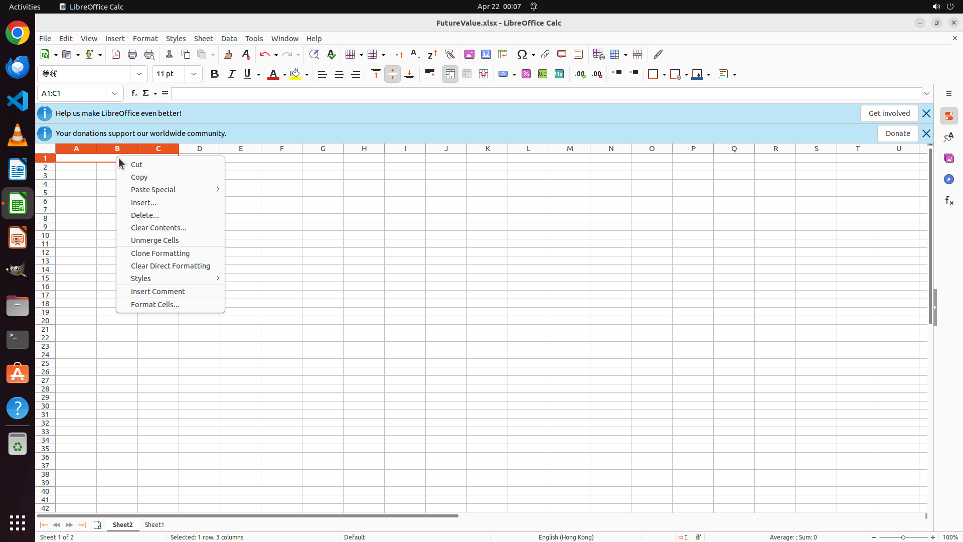 The cells A1:C1 are still selected but not merged. Previous attempts to click on "Merge Cells" from the context menu haven't been successful. I need to try again with a right-click to bring up the context menu.