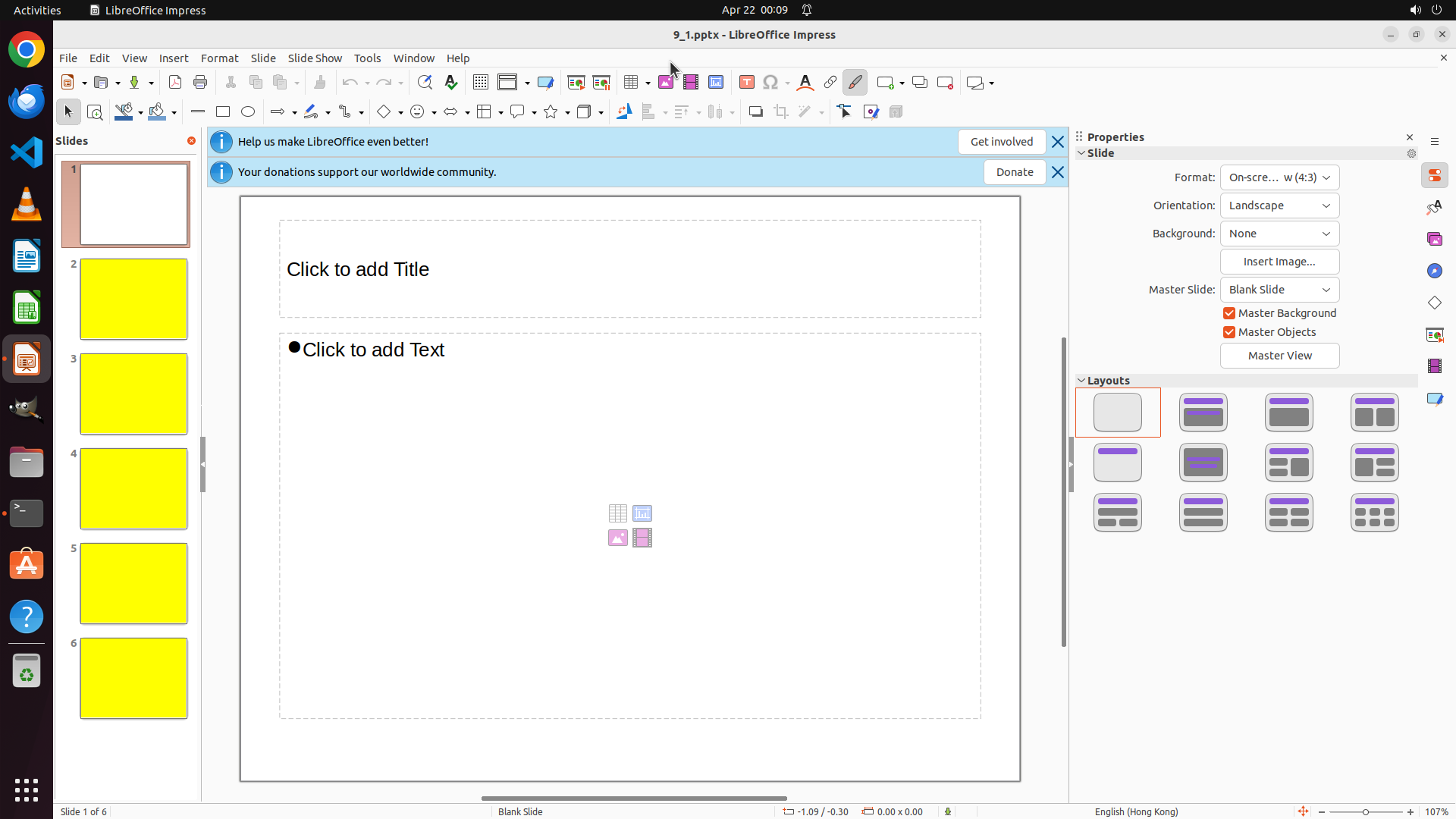 ## 6. 上一次操作的前50步操作简述 ### 步骤 1: - 描述: ``` #### 重要信息 - LibreOffice Impress 已打开,文件名为 "9_1.pptx" - 有一个终端窗口覆盖在 Impress 窗口之上,显示 Microsoft JhengHei 字体已安装("Microsoft JhengHei, 微軟正黑體") - 当前显示的是第一张幻灯片(Slide 1 of 6),为空白幻灯片(Blank Slide) - 需要关闭终端窗口才能操作 Impress #### 情况分析与思考过程 任务目标是在第一张幻灯片上插入标题 "Happy Family" 并设置字体为 Microsoft JhengHei。从终端输出可以看到该字体已安装。首先需要关闭终端窗口,然后: 1. 在幻灯片上插入文本框 2. 输入 "Happy Family" 3. 设置字体为 Microsoft JhengHei 第一步应该是关闭终端窗口,点击终端窗口右上角的 X 按钮。 ``` - 操作: 1. 左键单击坐标 (0.426, 0.076) ### 步骤 2: - 描述: - 操作: 1. 左键单击坐标 (0.471, 0.125) </SITUATION>